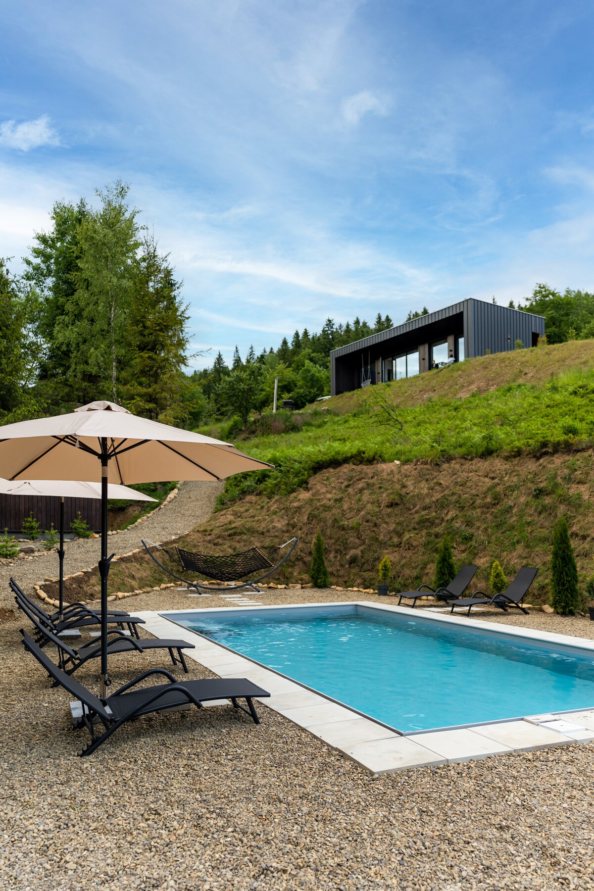 Et convidem a relaxar-te en una casa rural de luxe a les muntanyes amb finestres panoràmiques que ofereixen una vista magnífica. Hi ha un jacuzzi, un spa, una llar de foc i una terrassa amb barbacoa per a les nits a l'aire lliure. Per crear un ambient especial, un tocadiscs de vinil i un projector per a pel·lícules. És un lloc ideal per relaxar-se, envoltat de natura, comoditat i elegància amb els teus estimats o amics.