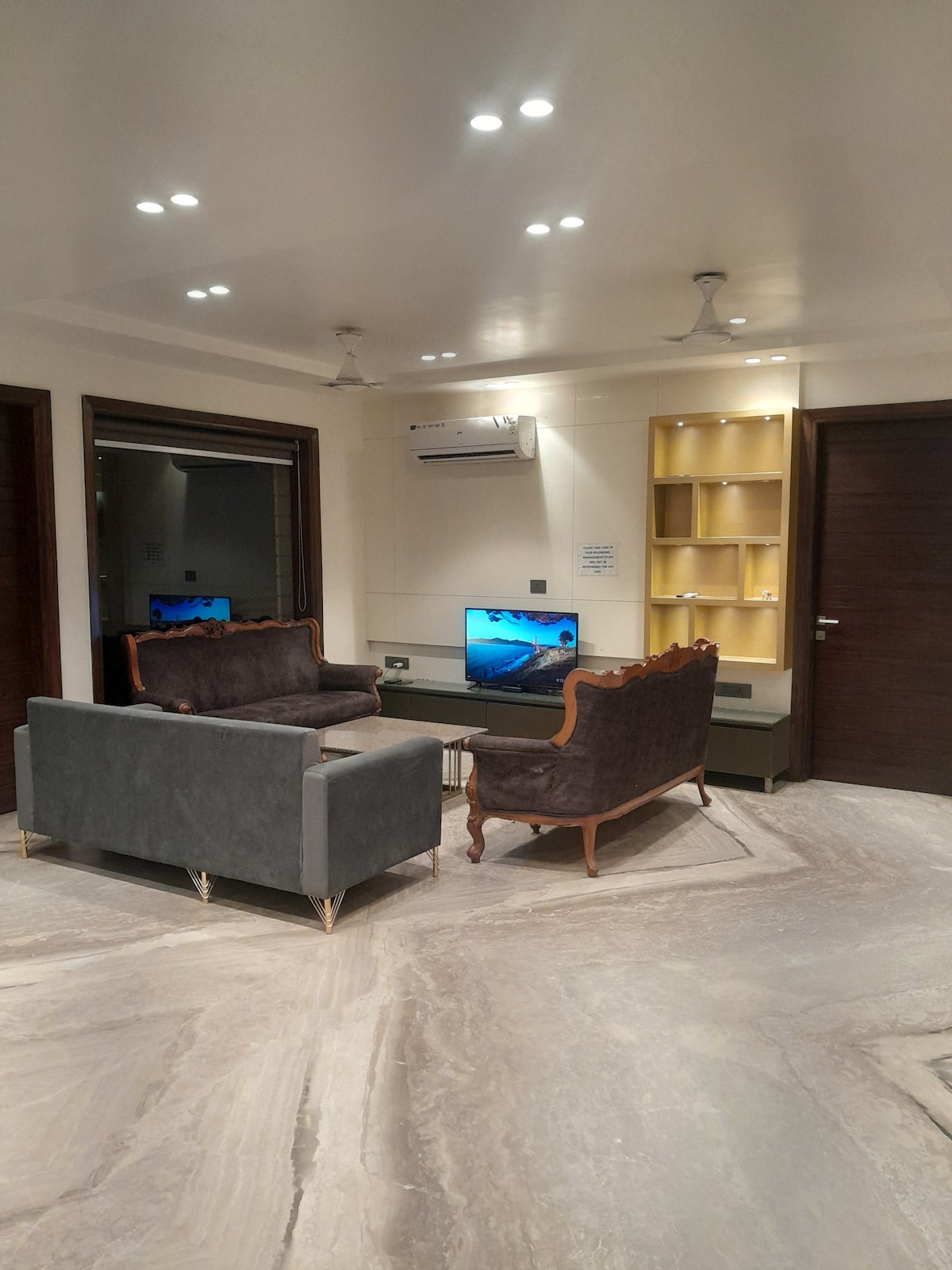 Et donem la benvinguda a HangOut AirBnB. Aquest serà el teu apartament de 3 habitacions amb aire condicionat al barri luxós de East Punjabi Bagh - Main Road. T'oferim altaveus de la casa, coberts bàsics a la cuina, televisor intel·ligent, guàrdia de seguretat les 24 hores i pocs cuidadors a temps complet per ajudar-te a tenir festes a casa segures i increïbles i aconseguir activitats. L'anunci mostra les imatges de la terrassa d'aquesta propietat. Això serà disponible amb un càrrec addicional de 15.000€. La terrassa no es proporcionarà a aquest preu.