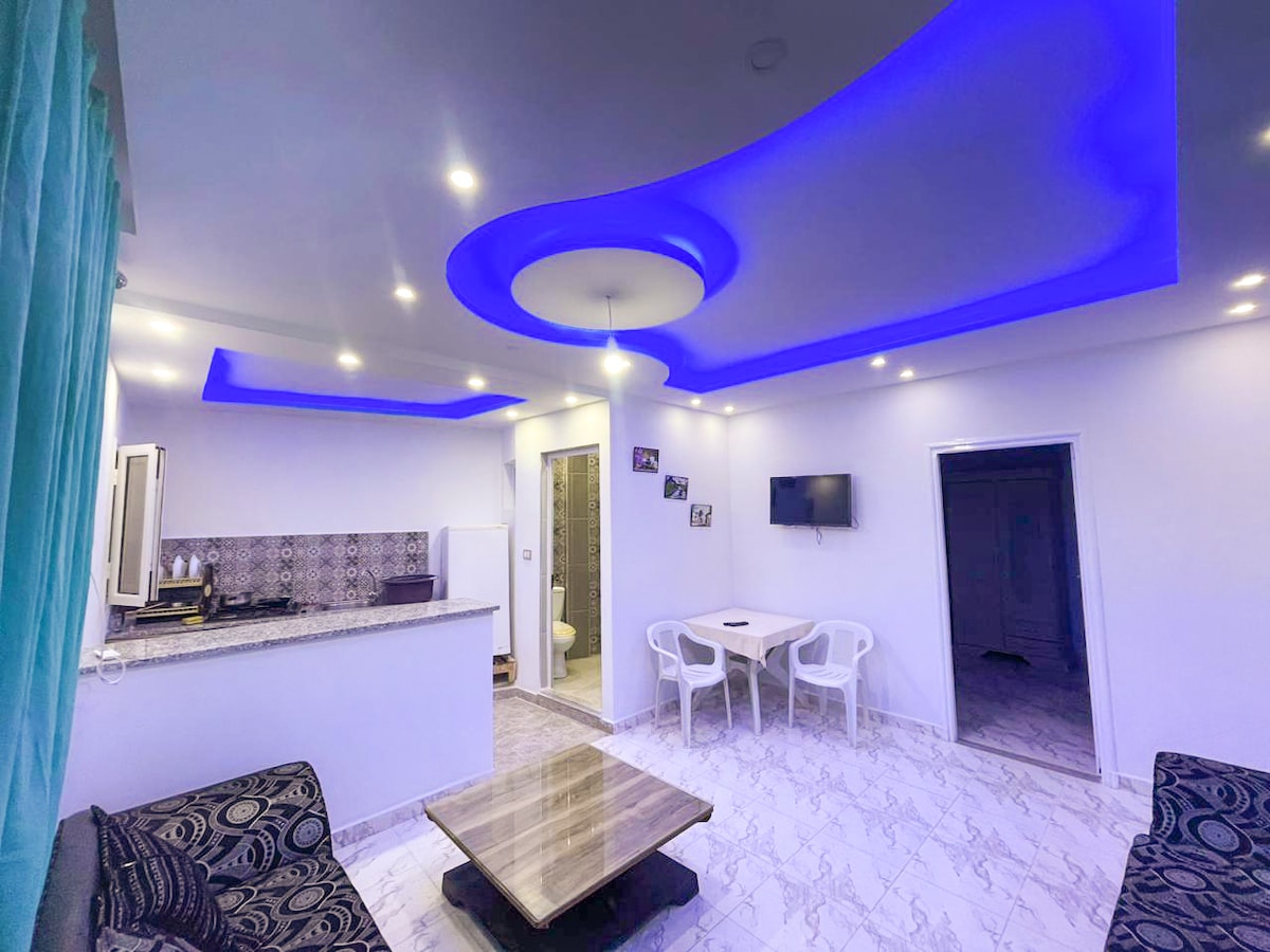 Pis S+0 totalment moblat, situat en una residència segura amb piscina. Recentment renovat, inclou un dormitori, un bany amb dutxa, una cuina equipada amb una zona de menjador lluminosa amb finestra de badia, així com una sala d'estar amb dos sofàs i un llit gran. Hi poden dormir fins a tres persones. L'apartament està a 5 minuts a peu de la platja de Hammamet Sud i a menys de 10 minuts en cotxe de Baraket Sahel.