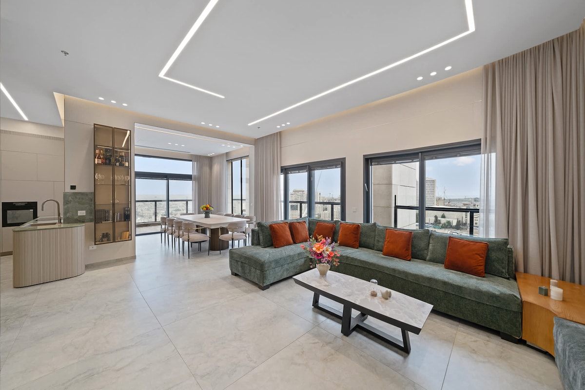 Àtic de luxe a la planta 22 de Rova 1, a l'entrada de Jerusalem. Impressionants vistes panoràmiques, 5 dormitoris + mamad (16 persones), 3 suites principals, sala d'estar enorme, cuina totalment equipada amb 2 forns i una terrassa de 50 m². Perfecte per a famílies o grups que busquen comoditat i elegància.
