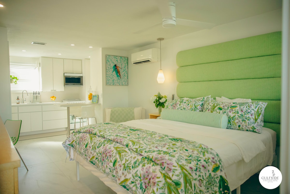 Aquest estudi forma part d'un hotel boutique de 11 unitats i s'obre a un balcó amb seients i una preciosa vista directa del golf de Mèxic. Disposa d'un llit de matrimoni i un sofà llit doble i té capacitat per a 3 adults o 2 adults i 1 nen amb tota comoditat. Els allotjaments inclouen: cuines totalment equipades (nevera de mida completa, fogons, microones de convecció, cafetera de filtres, estris bàsics de cuina), televisor de pantalla plana, articles bàsics de dutxa i assecador de cabells.
