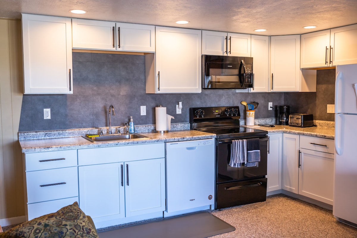 Recentment remodelat! Aquest allotjament d'estil rural modern és un lloc perfecte per a una família o amics. Ofereix 2 dormitoris, 1 bany amb banyera/dutxa, una cuina totalment moblada, un menjador i un gran pati tancat. Els dormitoris ofereixen dormitoris per a 4 persones amb 1 llit queen i 2 llits individuals. La cuina està totalment equipada amb productes de cuina i una cafetera Keurig amb diverses opcions per triar. Ús complet de l'allotjament, tancat al pati i rentadora/assecadora per a la teva comoditat.