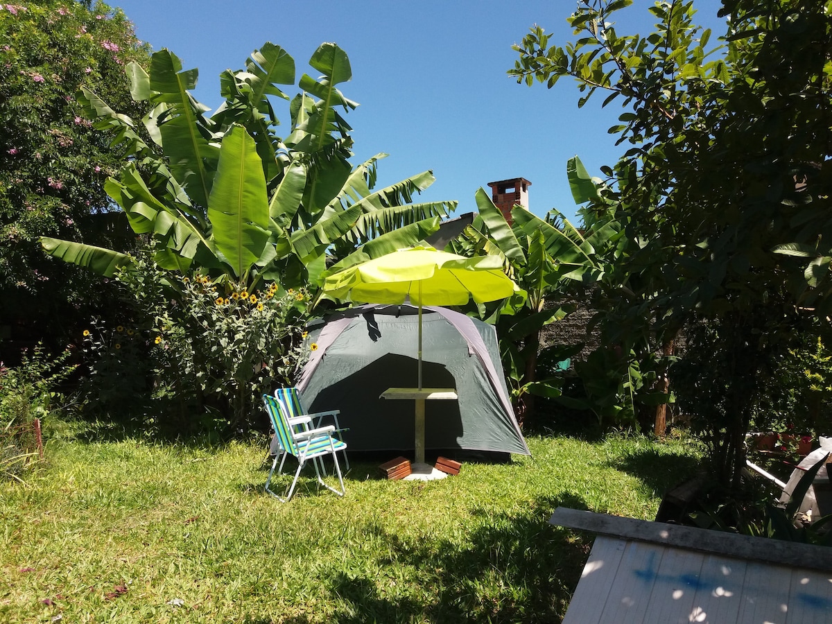 Reconecte-se à natureza neste mini camping proximo a Praia da Cal, barraca já montada com colchão roupas de cama e toalhas, ventilador. Espaço para preparar refeições equipada. Banheiro na casa sede.