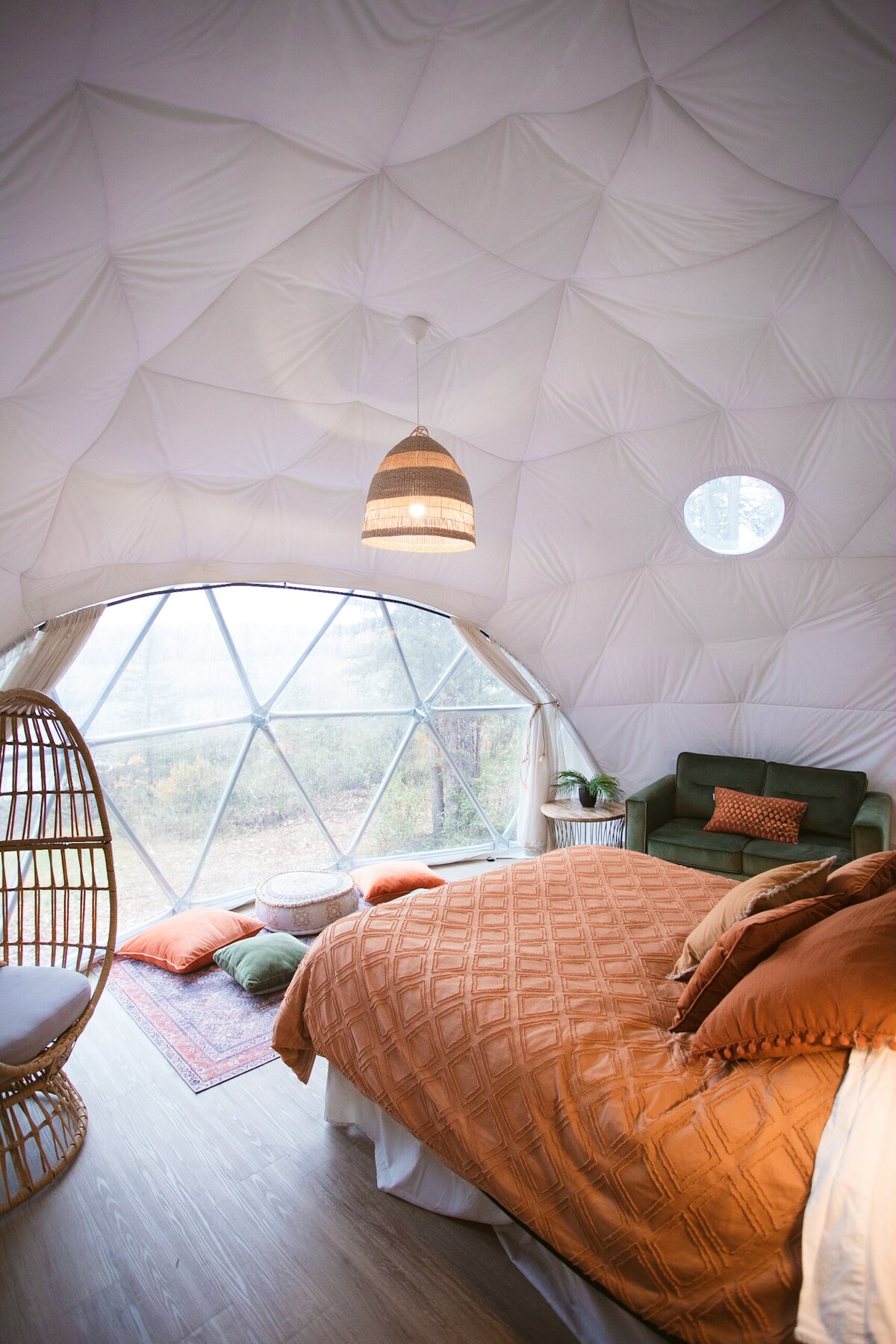 El Wheatgrass Dome és un refugi tranquil que abraça la calma de la praderia. Dissenyat en tons crema i marrons amb tocs d'inspiració boho, fomenta un ambient acollidor i creatiu. Aquesta cúpula està moblada amb un llit «queen size», uns còmodes seients per descansar i una petita taula per jugar o fer-hi àpats lleugers. Amb un calefactor, llums i un carregador de mòbil, el Wheatgrass Dome ofereix totes les comoditats d'una vida moderna en un entorn serè i inspirat en la natura.