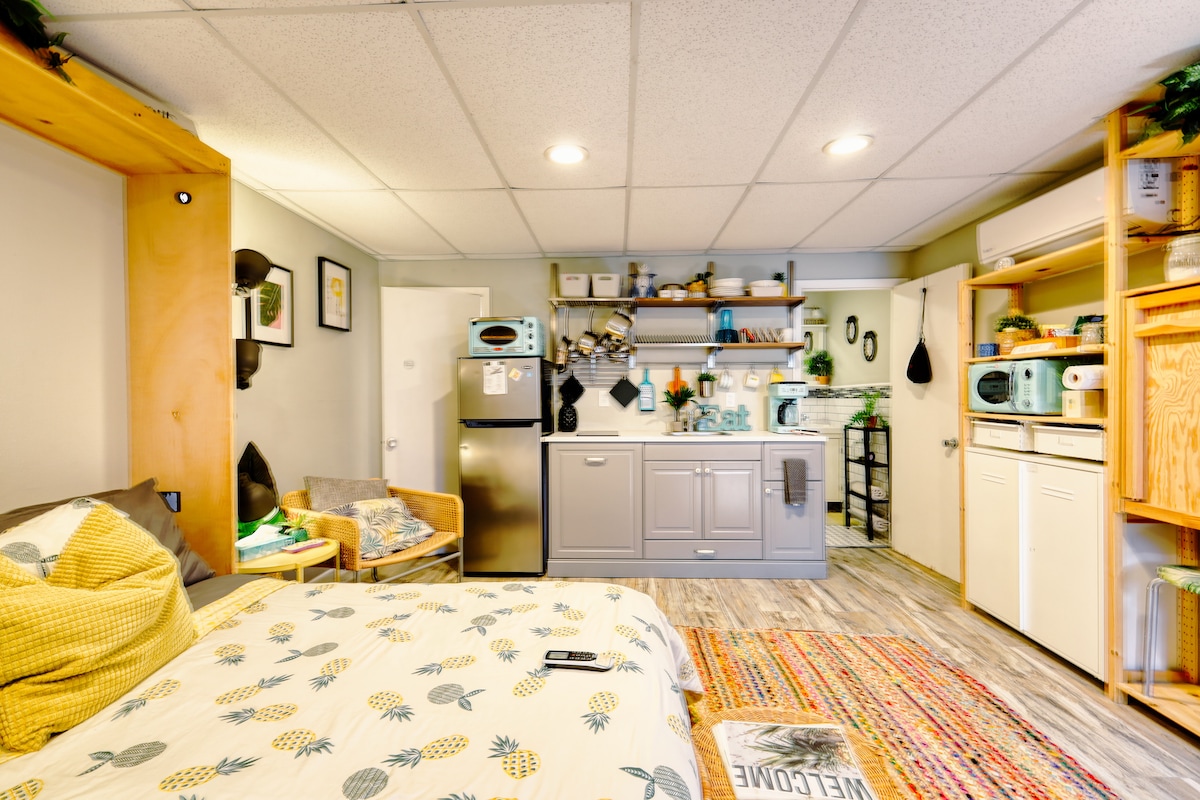 Et donem la benvinguda al bungalou Pineapple! Aquest espai petit i acollidor és perfecte per a aquells que volen un toc de minicasa. T'agradaria saber com de fàcil et pot sentir quan estiguis a prop de la vida de la ciutat que hi ha fora de la porta, però tens tot aquí dins d'aquesta bonica casa de bungalou d'estudi. Allotjaments assequibles mantenint alts estàndards de neteja i comoditat. Les mascotes també són benvingudes! Porta el teu nadó de pell per a les teves aventures! (animals de companyia subjectes a les normes de la casa)