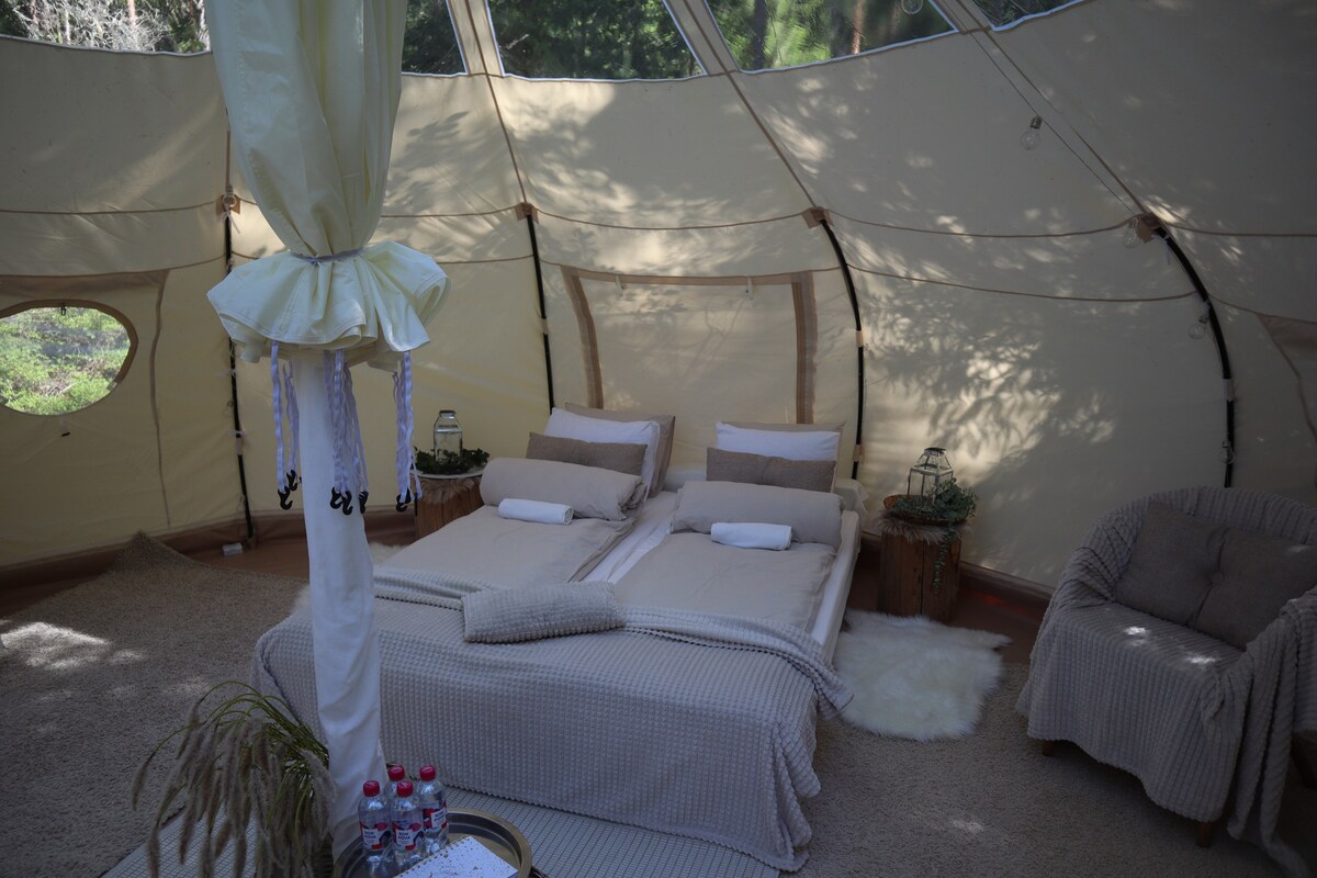 Dormiràs còmodament en un llit doble de debò. A la tenda de campanya gandules, calefacció, ventilador i il·luminació. Ús d'una cuina d'estiu i una graella de gas. El preu inclou una sauna de llenya tradicional amb bany durant el torn de sauna. Vàter exterior de compostatge. Dormes còmodament en un llit doble de debò. Banyeres, calefacció, ventilador i il·luminació a la tenda. Es pot fer servir la cuina d'estiu i la graella de gas. El preu inclou una sauna tradicional de fusta amb rentat durant el torn de la sauna. Vàter exterior de compostatge.