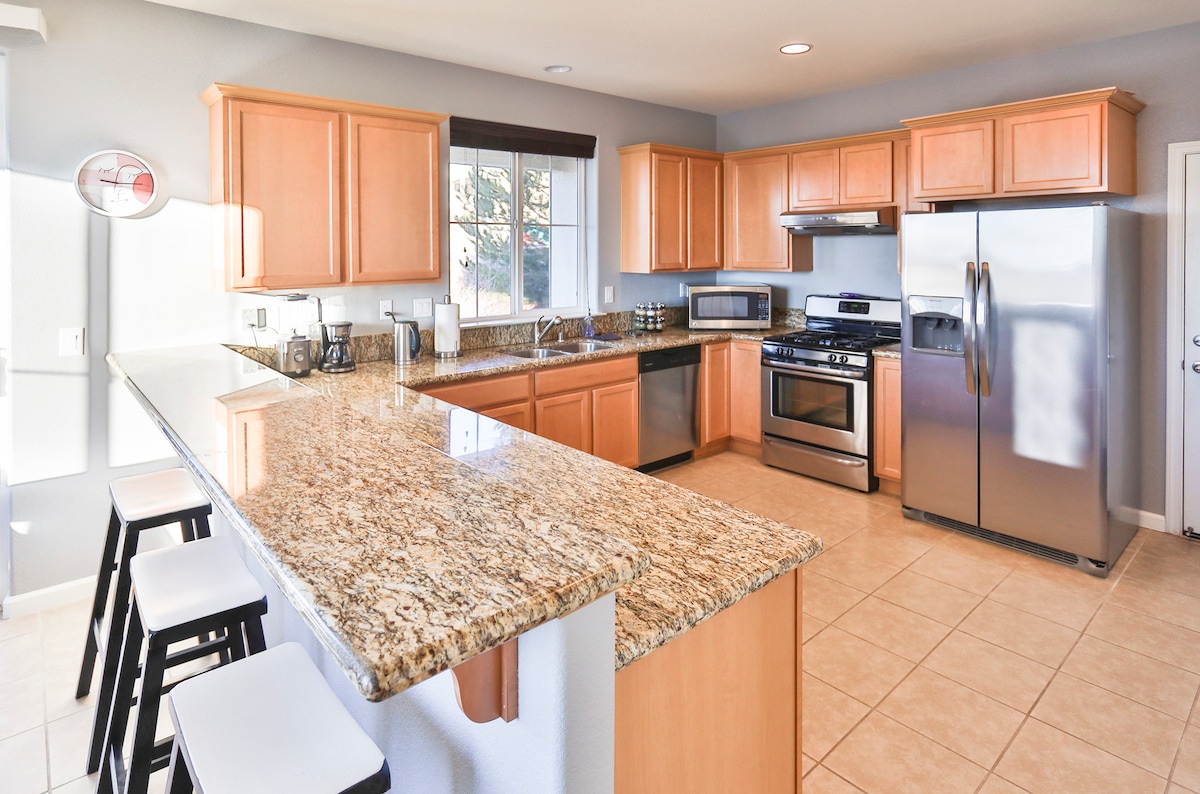 Beautiful one level newly remodeled NorthWest home with all new appliances - 7 minute drive to UNR - 10 minutes to Reno airport - 30 minutes to Mt. Rose - 7 minutes to downtown Reno - 40 minutes to Tahoe 3 bedrooms, 6 Beds, 2 bathrooms, all on ONE level n 2 car garage make this a perfect home for vacation. Large open family room with a fireplace, kitchen open to dining n living room n BBQ. It has new floor, paint, new furniture, all new beds with King size memory foam mattress in Master.