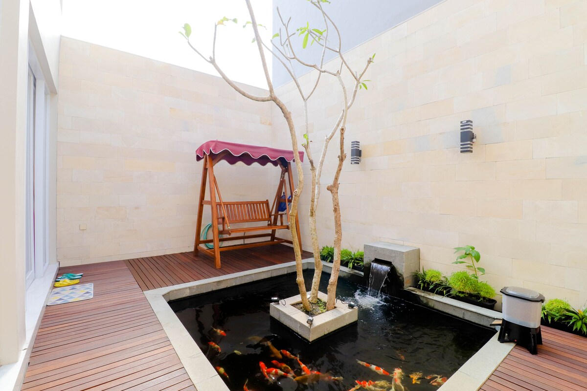 Casa amb 2 dormitoris i piscina privada a Yogyakarta. Cada habitació té aire condicionat. Hi ha 1 bany (dutxa, escalfador d'aigua i banyera). Apte per a famílies o grups de 4 persones, parelles o persones Hi ha una cuina amb estris de cuina i coberts, nevera, dispensador, fogons i arrocera disponibles. Sala d'estar amb televisor intel·ligent i accés a Netflix. Wifi gratuït. Hi ha un mini jardí, un terrat i un garatge per a 1 cotxe i 1 davant de la casa.