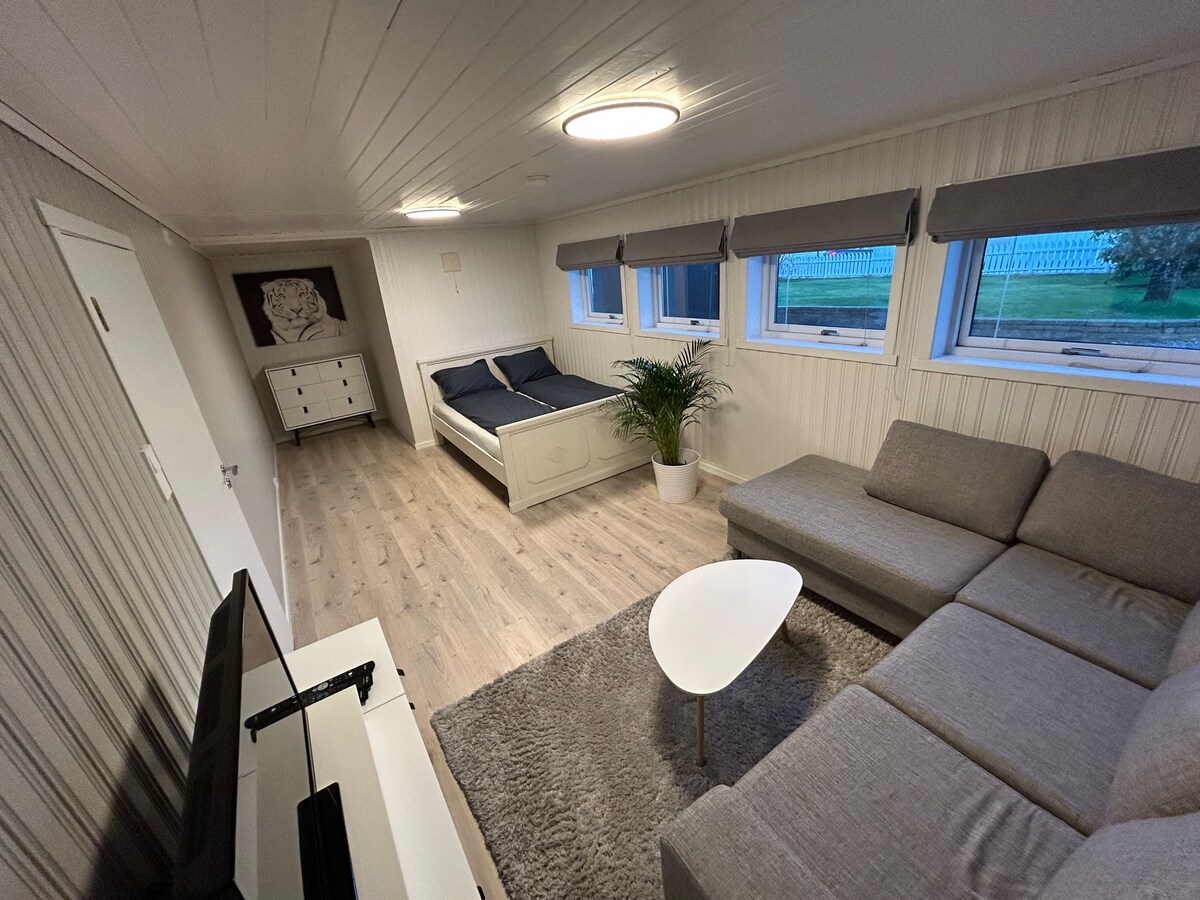 Apartament soterrani nou i agradable al centre, que està a només 650 metres del centre de la ciutat de Leirvik. Es troba a 2,5 km de la drassana, Aker. Hi ha grans zones de senderisme a prop per a aquells que els agrada passejar. A poca distància de la botiga, que també està oberta els diumenges. El pis soterrani està acabat de renovar i es va acabar el juny del 2024. Consta de cuina, sala d'estar amb sofà llit, bany i un dormitori. La cuina està ben equipada amb nevera gran amb congelador, rentaplats i rentadora. Per descomptat, la roba de llit i les tovalloles estan incloses.