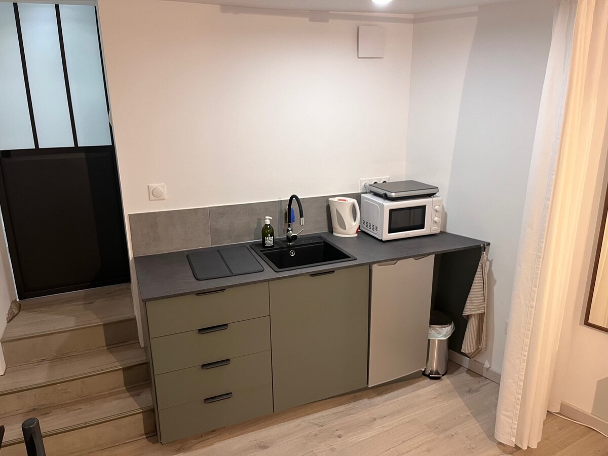 Allotjament d'una sola planta de 43 m2 amb vistes al pati que comprèn una sala d'estar, amb cuina oberta, bany i vàter. Terminal de metro B (hospitals Lyon Sud) Accés immediat al centre de Lió Part Dieu/Bellecour/Vieux Lió (12 minuts amb metro) i a prop de les carreteres principals (A6 A7 i Nationale 6) aparcament gratuït/allotjament únic i tranquil per a feina, formació o atenció mèdica. Aquest allotjament, situat en una granja de jardiners, ofereix comoditat i tranquil·litat.
