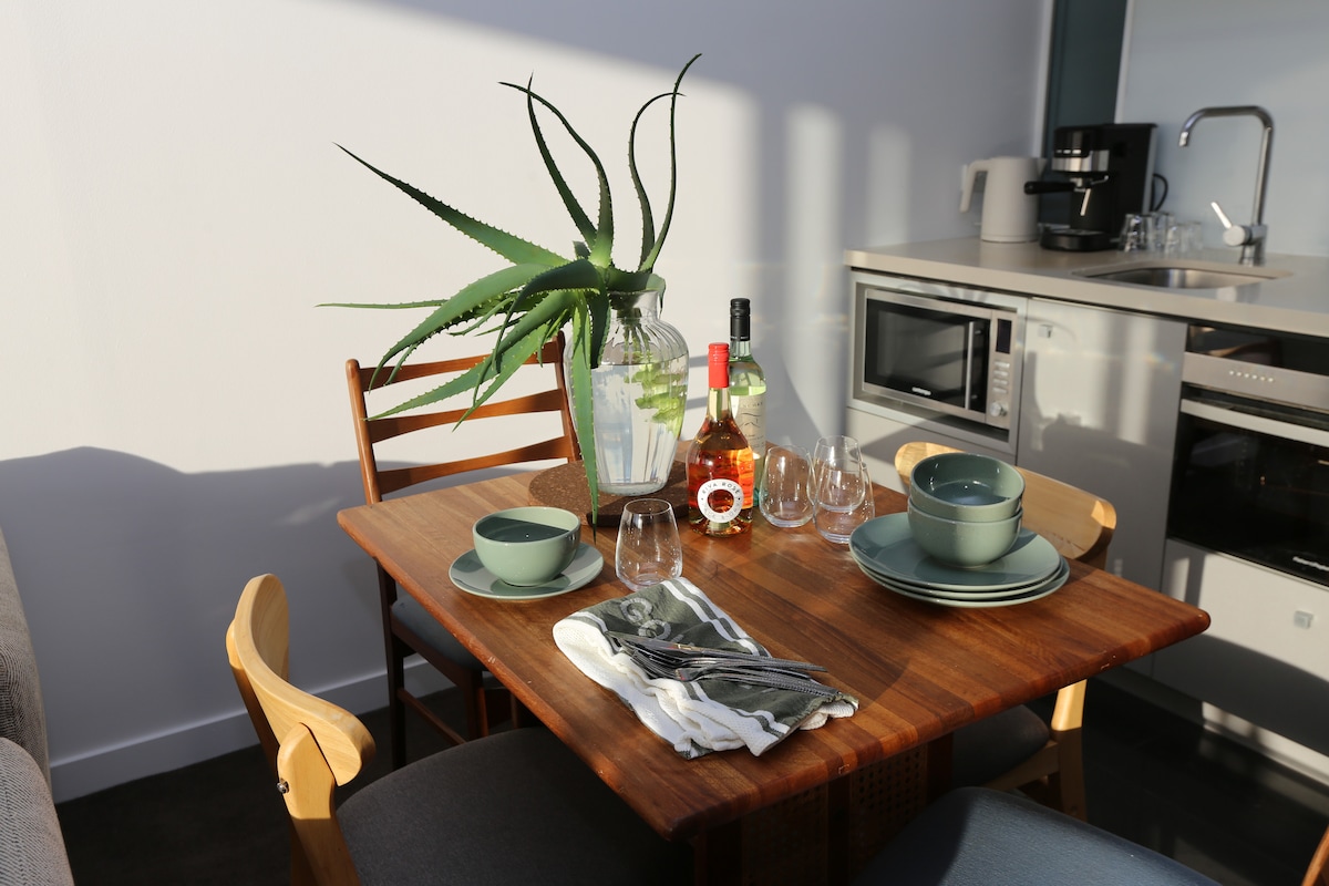 Et dono la benvinguda al meu pis amb unes vistes impressionants de la ciutat. Situat al cor de Fitzroy Street, St Kilda, aquest oasi urbà ofereix una estada còmoda per a aventurers solitaris o parelles. Quan entris, trobaràs tot el que necessites, des d'una cuina ben equipada i una sala d'estar amb un sofà de 2 i 3 places i un televisor de 75 polzades. El dormitori principal té una paret de finestra de vidre que permet una vista enlluernadora de la ciutat des del llit. Amb la seva il·luminació suau i el disseny minimalista, descansaràs bé.
