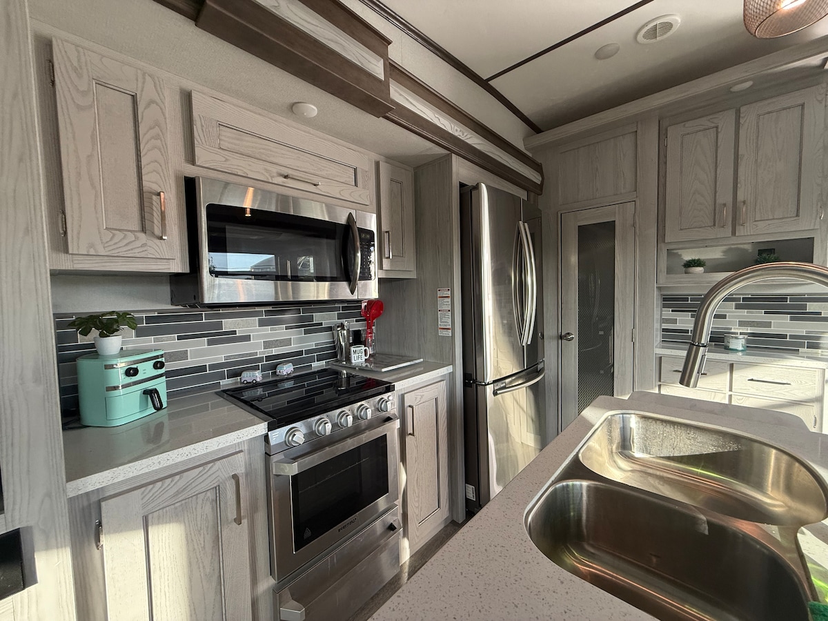 Tant si ets aquí per unes vacances a la platja, una escapada a la muntanya o un retir per treballar des de qualsevol lloc, aquesta luxosa roulotte ofereix totes les comoditats de la llar, amb un toc únic. • Un interior d'estil residencial amb sostres alts, mobles de mida completa i molt d'espai per estirar-se. • Una cuina totalment equipada amb electrodomèstics moderns, perfecta per cuinar a casa. • Acollidora sala d'estar amb butaques reclinables, televisor gran i llar de foc per a la màxima comoditat • Bany complet amb dutxa a peu pla