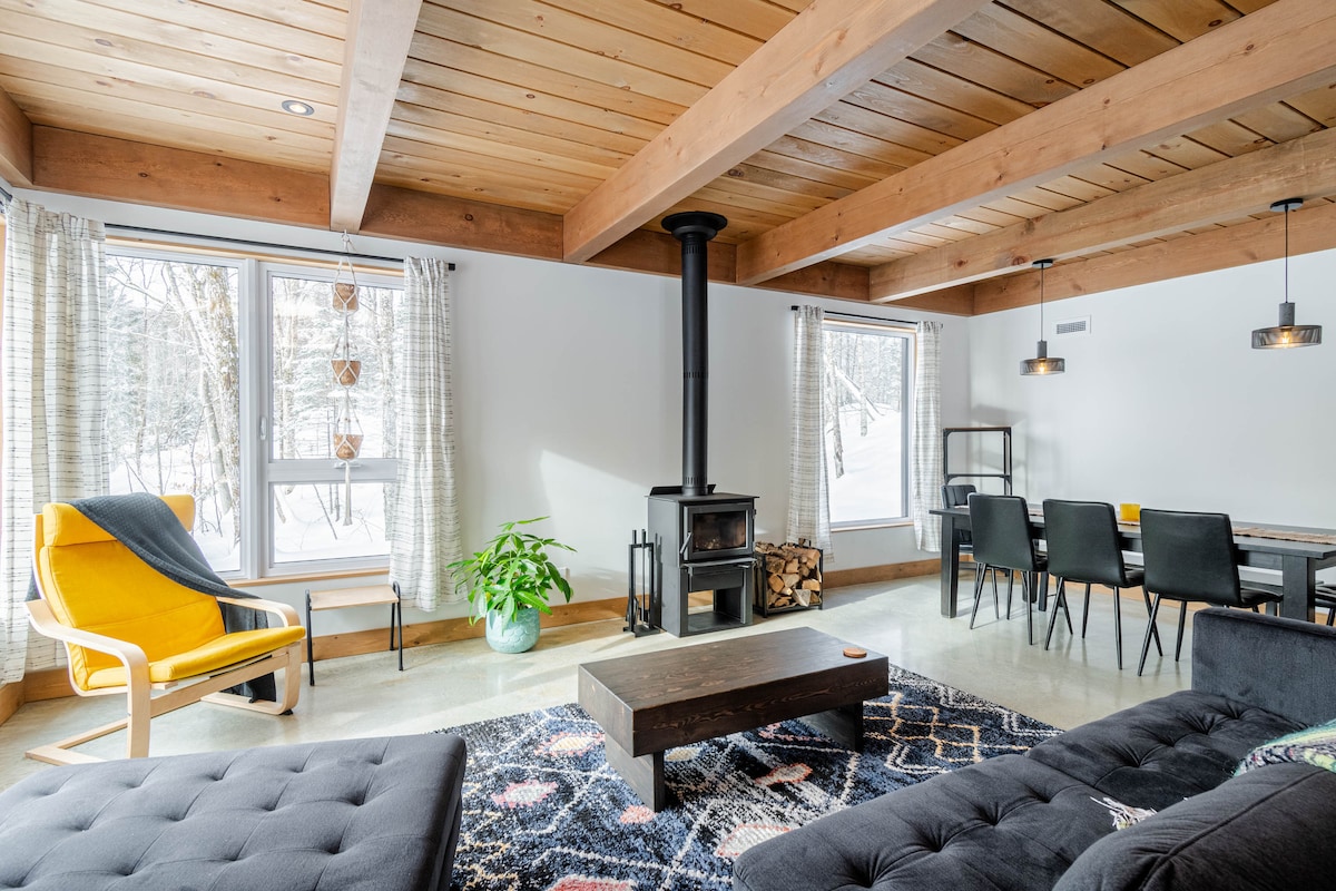 CITQ: 305728 | Cad.: 31-07-2026 Gaudeix de la natura des de tots els angles a Chalets d'Auvergne! En un lloc boscós privat de més de 100 hectàrees al llarg del riu Sainte-Anne, vine i descobreix la bellesa i la tranquil·litat. Una experiència immersiva al cor de la natura en un xalet de luxe amb vocació ecològica. Rutes amb raquetes de neu, moll, natació, caiacs i diversió inclosos! El refugi ideal per recarregar les piles. Internet d'alta velocitat i televisor intel·ligent a l'allotjament. Ideal per teletreballar. A 50 minuts de Quebec