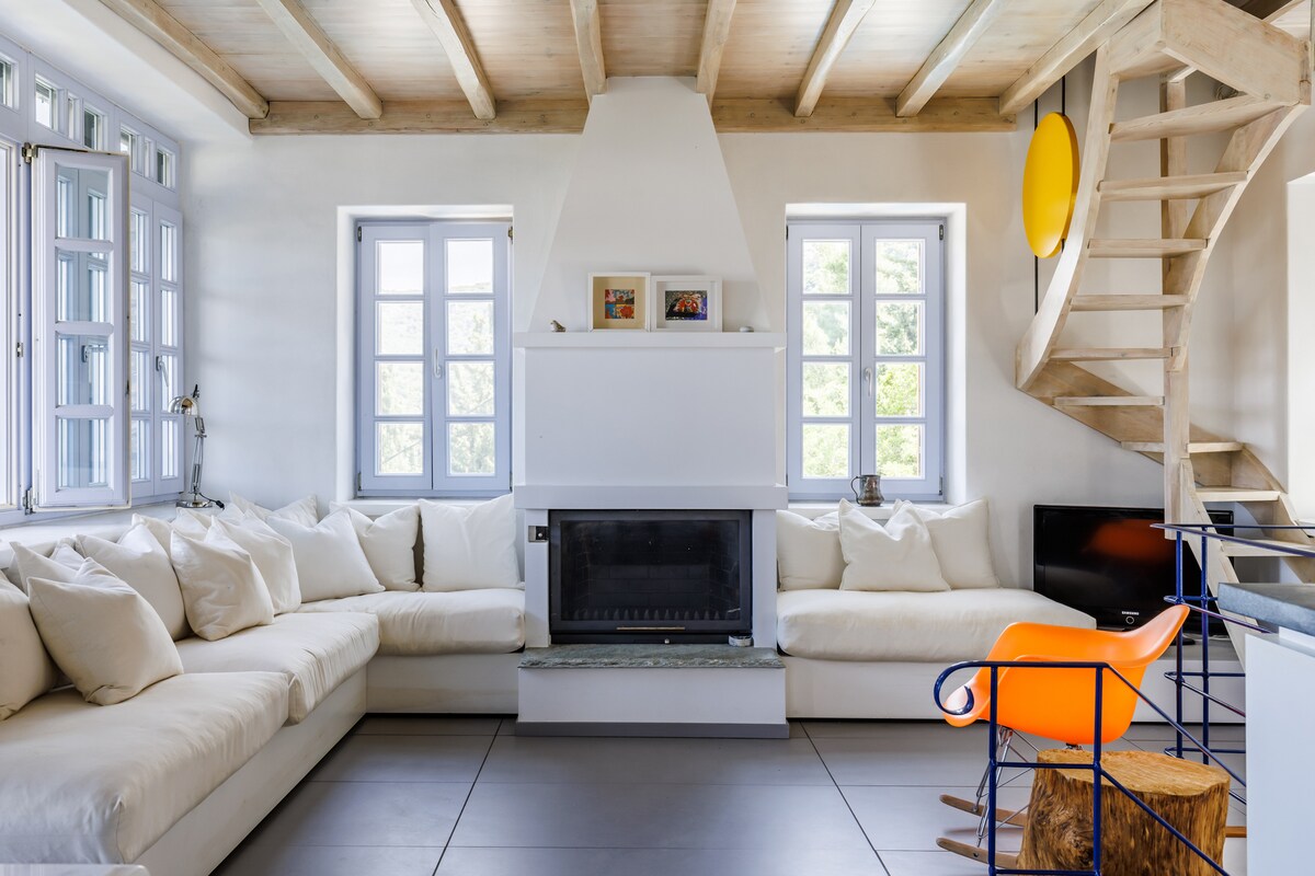 The fully renovated three-story Villa Skopelita offers a double bedroom, a twin bedroom with two single beds, and an extra single sleeping option via a pouf bed in the living room, ideal for a child. It includes two bathrooms and a bright living area. Highlights include its unique style and a spacious patio with breathtaking, uninterrupted sea views. Due to its location and overall buety, Villa Skopelita, is one of the island’s most photographed homes!