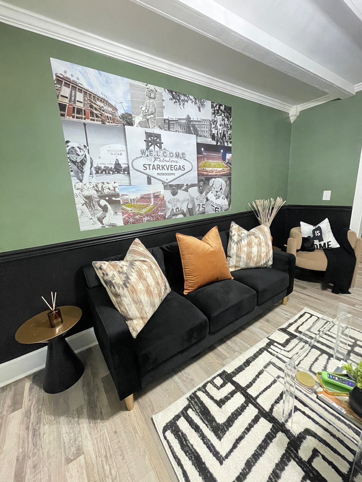 Viu l'experiència d'un dia de joc elevat a House of Rivals, Cowbell Row: camina fins al campus de l'estat de Mississipí i a l'estadi Davis Wade. Aquest refugi de luxe de 3 dormitoris i 3,5 banys inclou una graella Green Egg, una sala de foc i cafeteries gourmet, de gofres i de crispetes. Dissenyat per a fans exigents i famílies, és la base ideal per als caps de setmana d'esports de la SEC, les festes de cuina a l'aire lliure i els records eterns de Starkville. No et perdis l'experiència de fer les teves pròpies esquelles. Demanem als hostes que la decorin i que hi deixin una esquella.