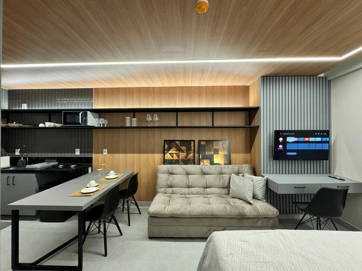 Pis amb 25 m2 nous, espaiosos i moderns Cama casal Bed and Bath Enxoval Cuina completa: vaixella, coberts, estris de cuina, estris bàsics Cuina d'inducció d'1 fogó Batedora Sanduicheira ° Minibar; Taula de menjador i cadires Smartv • Cafetera ° Microones; Edifici ben ubicat Bugaderia a la zona comuna Sala de fitness Piscina a la teulada Espai gourmet (pagant una tarifa al complex residencial) Espai de treball (coworking) Aparcament giratori Porter 24 hores Per a la neteja o una persona addicional: 70 R$