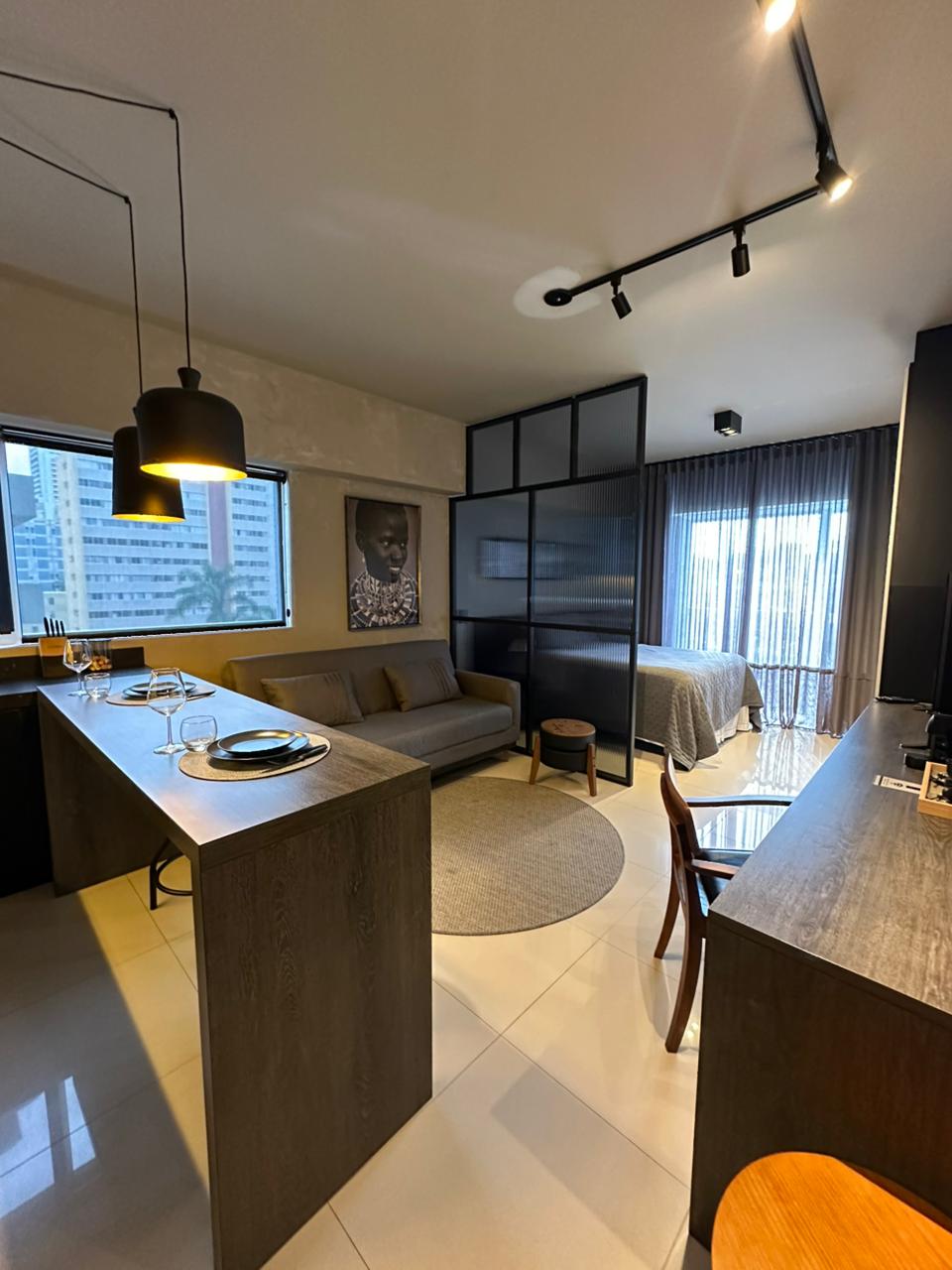 Estudi modern, nou, acollidor, ubicació perfecta, amb una vista preciosa des del balcó, especialment de nit . Wifi ràpida, escriptori, televisor intel·ligent de 55 polzades, llit «queen size». Aire condicionat (fred/calor). Rentadora i assecadora i una illa preciosa a la cuina. 50 m2 d'estil molt 27, tranquil. Al centre/Batel, a prop de botigues, bancs, centres comercials, centre gastronòmic i Hospital . A l'edifici :piscina, gimnàs, sala de jocs, sauna, jacuzzi, conserge les 24 hores.