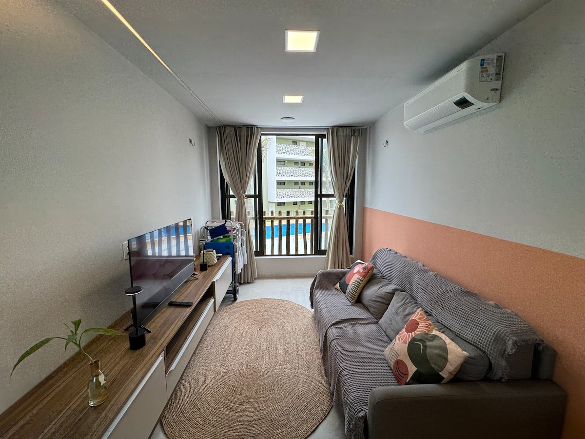 Aquest preciós pis d'estil bohemi situat a Barra Grande, a poca distància a peu de la platja i dels restaurants, ofereix una escapada tranquil·la d'una ciutat bulliciosa. El condomini disposa de seguretat les 24 hores, aparcament assignat, un ampli terrat amb seients i un bar, així com una gran terrassa comunitària amb barbacoa i un bar amb piscina. Aquest apartament amb serveis disposa d'una nevera i una cafetera i un llit de matrimoni que es pot ampliar encara més per afegir dos llits individuals i capacitat per a quatre persones.