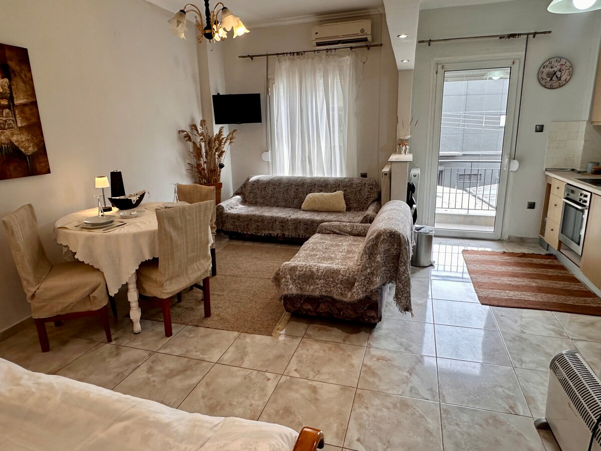 Relaxa't amb tota la família dels teus millors amics al nostre apartament tranquil i funcional. :) El nostre apartament està situat a 20 minuts del centre de la ciutat a peu i a 5 minuts del casc antic gràfic de Tessalònica. (Ano poli- Kastra) El nostre pis és tranquil i està totalment equipat amb totes les comoditats que puguis necessitar. Els aspectes més destacats: - Aparcament gratuït i segur per al teu vehicle. - Amplia sala d'estar amb 55' Q Led Televisor intel·ligent i balcó amb menjador. - Recomanacions per a amfitrions atents i útils.