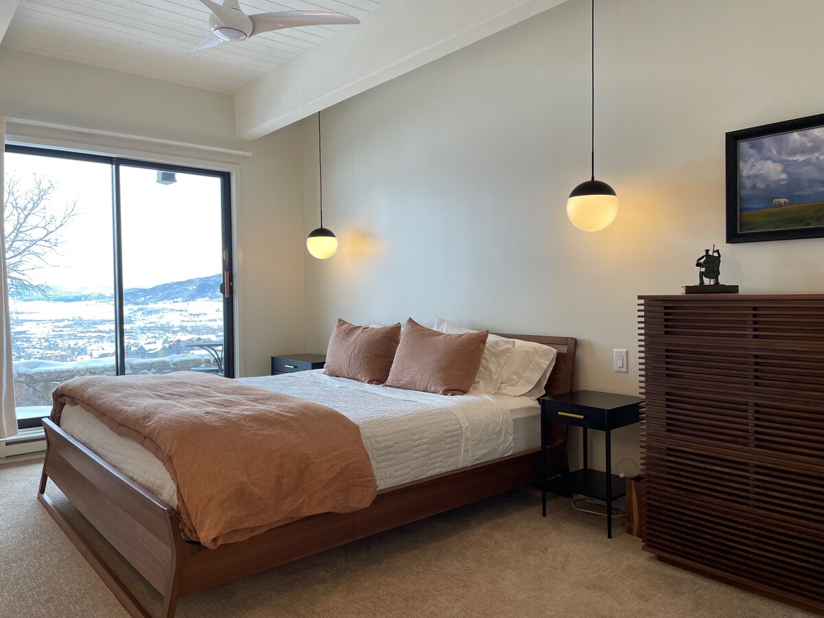 Aquest espai amb 1 dormitori, 1 bany, cuina, sala d'estar i menjador s'ha dissenyat intel·ligentment com a unitat complementària de la casa principal. L'allotjament de 800 peus quadrats té 2 nivells amb el dormitori i el bany al nivell superior. Llum natural al matí. Ofereix vistes i privacitat ~ Mirant cap al sud a través de la vall de Yampa i cap a Flat Tops. Mobilat d'una manera moderna i elegant, té tots els equipaments i serveis d'alta qualitat que necessites, així com una entrada privada. Autobús gratuït + aparcament. Steamboat Resort està molt a prop... i permetem 1 gos.