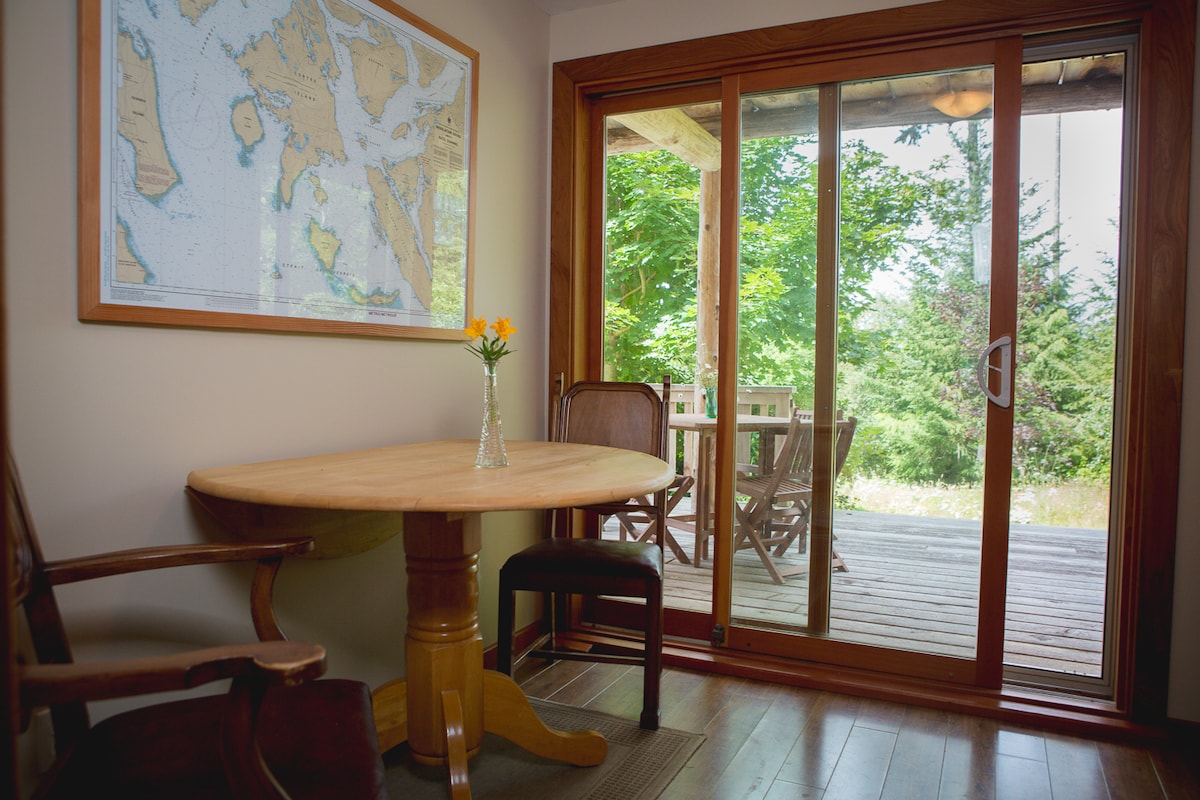 Welcome to Eureka House on Hornby Island. Located on 3 acres of secluded, untouched forest on the side of the Mount Geoffrey Escarpment, you can take in its breathtaking panoramic ocean and mountain views from your private hot tub. Relax in front of the fire or in the handcrafted sauna after a day of hiking or mountain biking in the adjacent Provincial Park. High speed internet and cell service keep you connected. July - Sept are 1 week min. Oct - April are 1 month min. Msg for details.