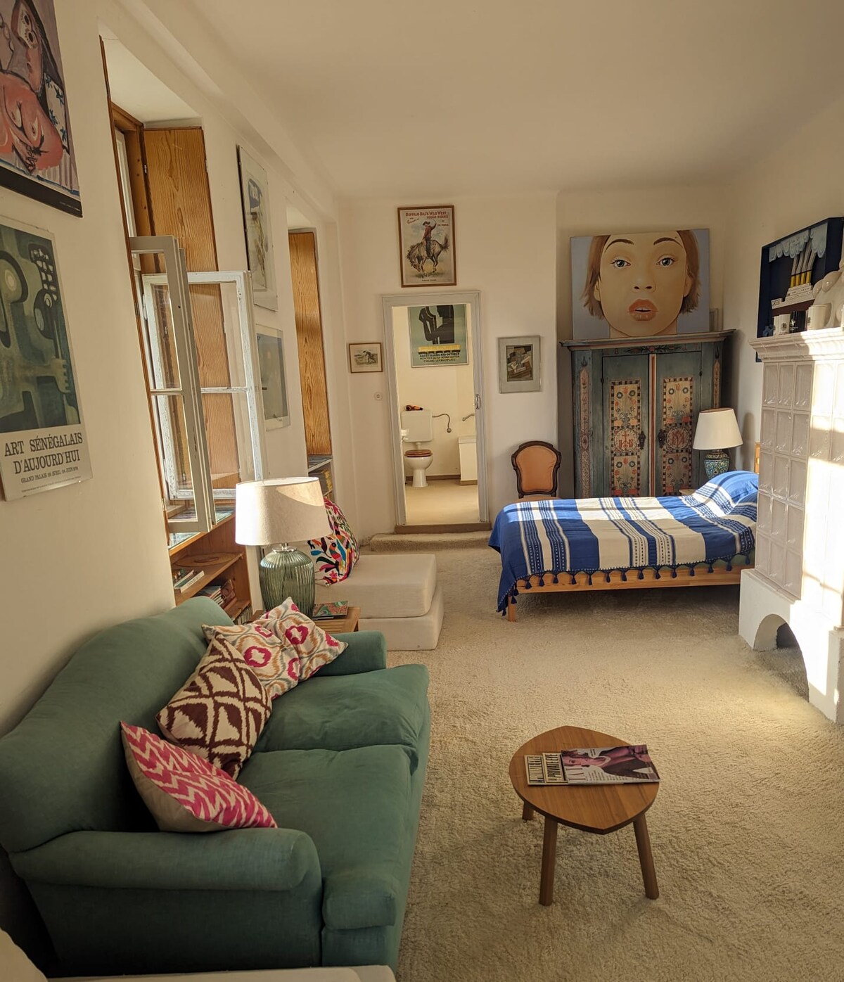 Aquest pis es deleix amb una sala de cinema privada 🎬 i un punt destacat especial: un elegant motiu de paret de pavo real amb plomes reals🦚. Malgrat la seva ubicació cèntrica, és agradablement tranquil, ja que està situat al pati protegit. El mobiliari elegant, l'ambient acollidor i la molt bona connexió fan que sigui el refugi ideal per als visitants de la ciutat.