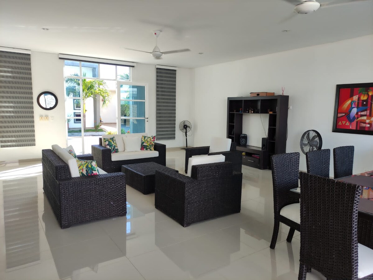 Gaudeix d'una temporada de tranquil·litat en una casa moderna moblada en temps càlid, amb zones socials espaioses i integrades, la cuina és integral i oberta amb una illa central, té 4 habitacions amb bany privat amb aire condicionat cada una, a la zona del darrere hi ha una piscina amb jacuzzi adequada per a nens, també disposa d'una barbacoa de carbó amb barbacoa de carbó i barbacoa de gas d'estil americà.