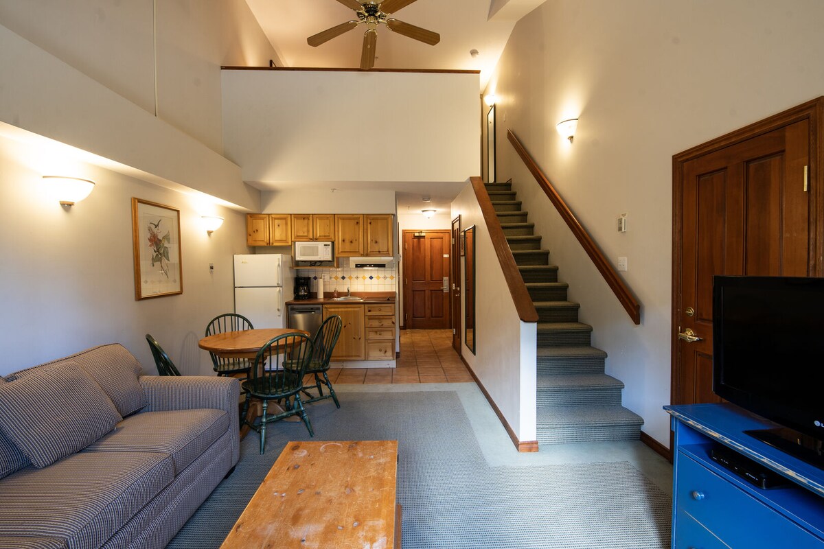 Loft al cor del poble. Accés a les pistes d'esquí i als remuntadors principals. Situat a pocs passos de tots els restaurants, botigues, serveis i condominis G.C. Cuina eficient amb fogons de 2 cremadors (sense forn), nevera de mida completa, microones bullidor, cafetera i rentavaixelles, televisor, wifi gratuït i llar de foc de gas. Pis amb capacitat per a 4 persones amb un llit «king size» i un sofà llit «queen size». No es pot fumar. El lodge ofereix un magatzem d'esquí, una bugaderia de monedes, 2 banyeres d'hidromassatge, gimnàs, aparcament climatitzat, 20 dòlars/nit més GST.