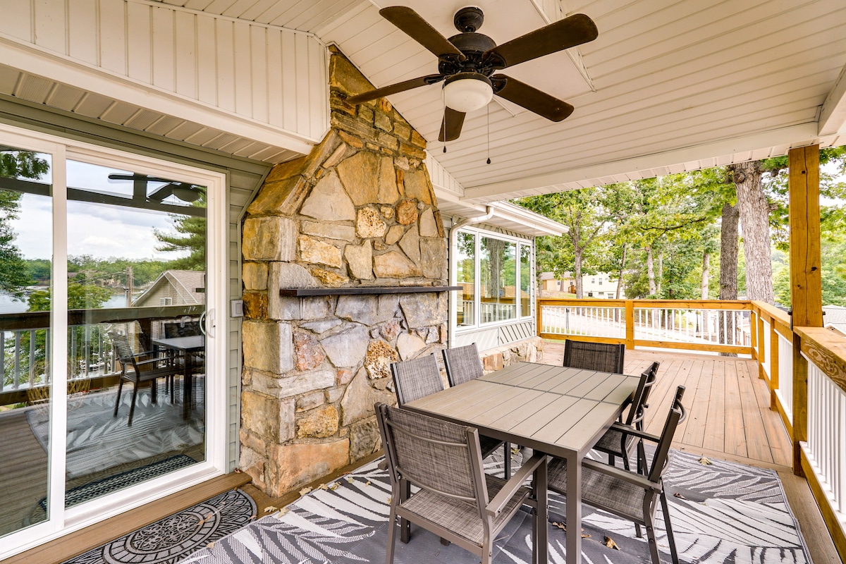A un pas del vehicle hi trobaràs una vista espectacular de 180 graus del bonic llac dels Ozarks. El nostre allotjament de 260 m² ofereix una combinació poc habitual de vistes sense interrupcions i un accés fàcil a més de 60 metres de costa. Gaudeix de l'aire lliure en 4 terrasses, incloent-hi un pati de pedra original dels anys 50 amb un fogar. La suite principal et farà sentir com si visquessis a l'aigua. 3 banys complets 3 dormitoris Wet bar Taula de billar Pinball Barbacoa exterior de propà Conducció pavimentada Aparcament per a 4 vehicles