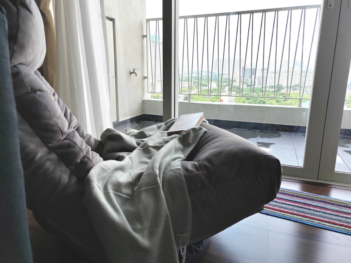 Aquest apartament 1 Br té una vista impressionant de l'horitzó de KL. Disposa d'un sofà sala d'estar de 3 places, taula de menjador, cuina, escriptori i un gran balcó davant de la Torre KL i les Torres Bessones Petronas. Inclou un televisor de 55", WIFI d'alta velocitat i un llit« queen size »que et pot allotjar còmodament. *L'altra unitat d'aquest apartament de doble clau és un estudi compacte amb llit de matrimoni, rebost, bany i bany. Pot encaixar amb els amics que viatgen amb tu amb privacitat. Et donem la benvinguda per demanar-nos més informació!