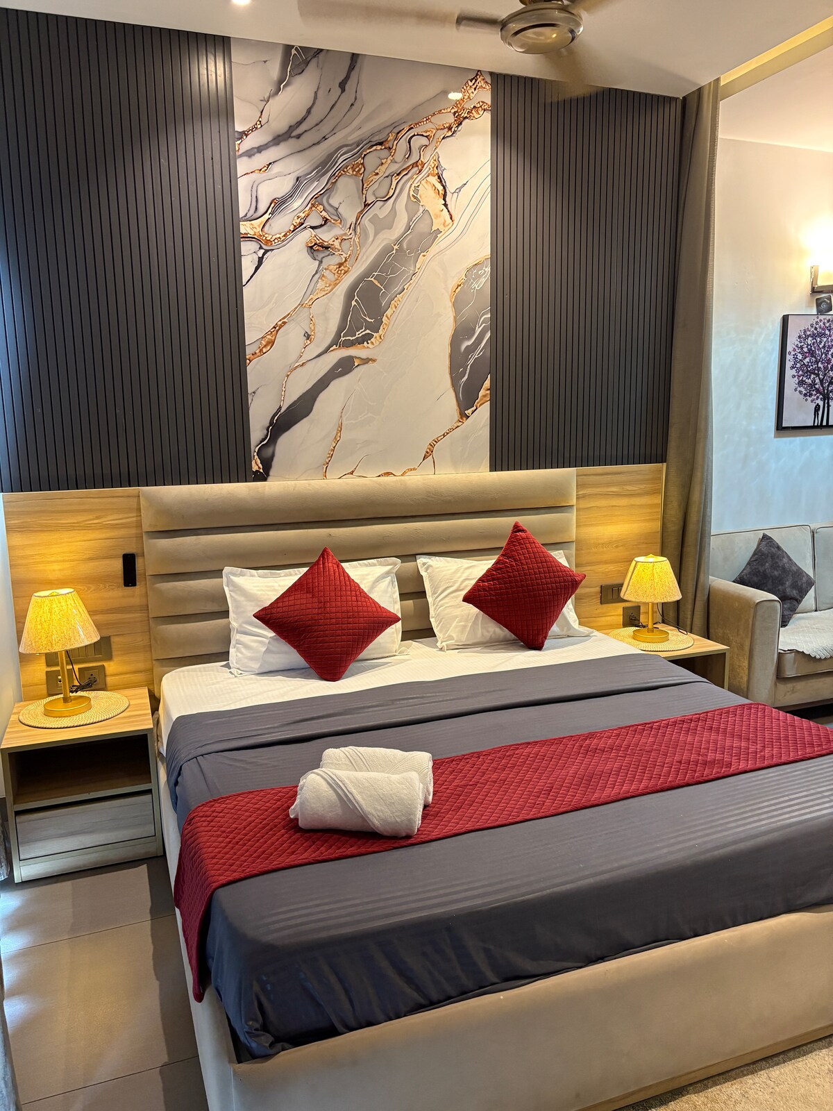 El primer pis de 2 Bhk que compleix tots els requisits ✨ - 2 dormitoris ( dormitori principal, segon dormitori) - 2 llits «king size». - Una sala d'estar espaiosa amb una disposició de seients còmoda. - 2 banys ( 1 a cadascun dels dormitoris) - Cuina petita (amb tots els estris bàsics de cuina disponibles i equipament i serveis, és el lloc perfecte per preparar els teus àpats preferits) - Una zona de balcó compartit que connecta amb l'apartament, que pot ser l'espai perfecte per a les teves passejades nocturnes. Reserva ara!