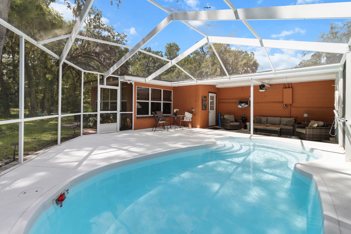 Beautiful serene 2026 remodeled home one mile from Ichetucknee State Park! Also close to Ginnie, Blue, Poe, Royal, and Little River Springs. Step outside with your coffee and enjoy the wooded neighborhood and river views/access. Large screened porch and well appointed open kitchen perfect for cooking. The house is elevated which creates a separate covered outdoor area with hammocks and a full second bathroom. Perfect cozy space for a couples retreat! Treehouse as an add on for extra guests.