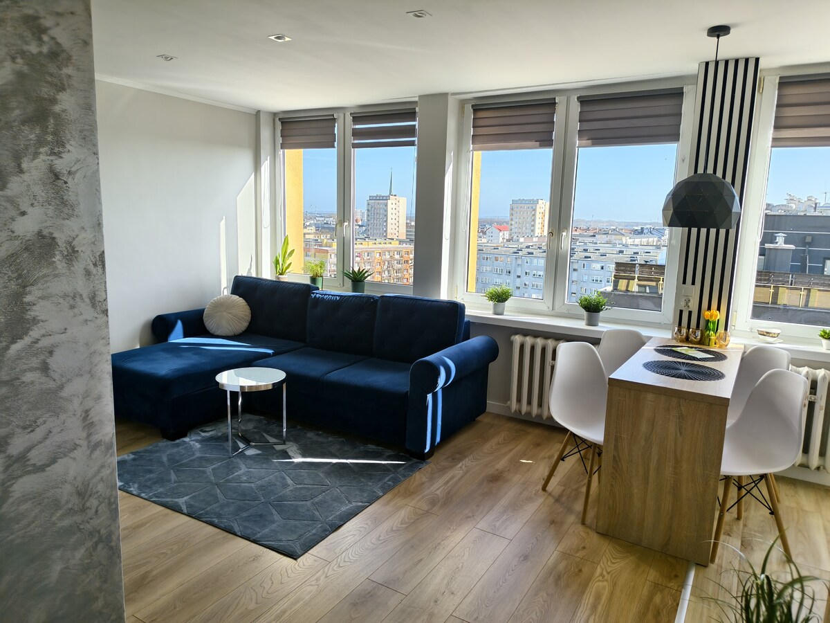 Estudi modern (31 m2) a la 13a planta del complex Platan a Świnoujście. Vistes impressionants del mar i del perfil urbà, un interior lluminós inspirat en la platja i el sol. Cuina americana totalment equipada, llit gran, sofà llit, bany elegant. A pocs minuts a peu de la platja i del passeig marítim, a prop de restaurants, botigues i del telecadira UBB. El lloc perfecte per a una estada romàntica o un cap de setmana relaxant al mar Bàltic.