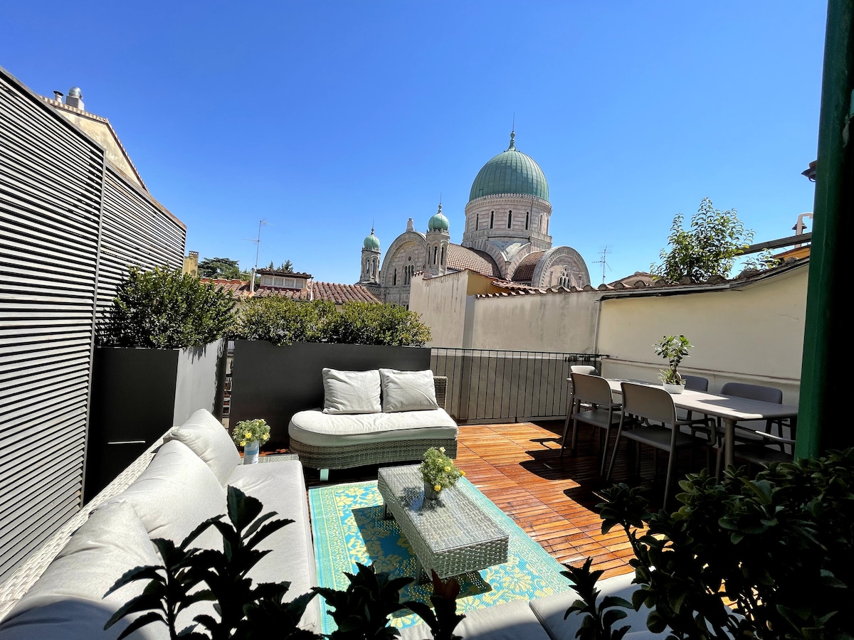El terrat es troba a la tercera i última planta, sense ascensor (on els valents s'atreveixen) d'un petit edifici al animat barri de Sant'Ambrogio, a pocs passos de les principals atraccions de la ciutat. Des de la terrassa, podràs gaudir de les vistes dels terrats de la ciutat, incloent-hi la cúpula de Brunelleschi i la cúpula de la sinagoga. L'apartament es va renovar completament l'estiu del 2022 per oferir-te el millor allotjament possible.