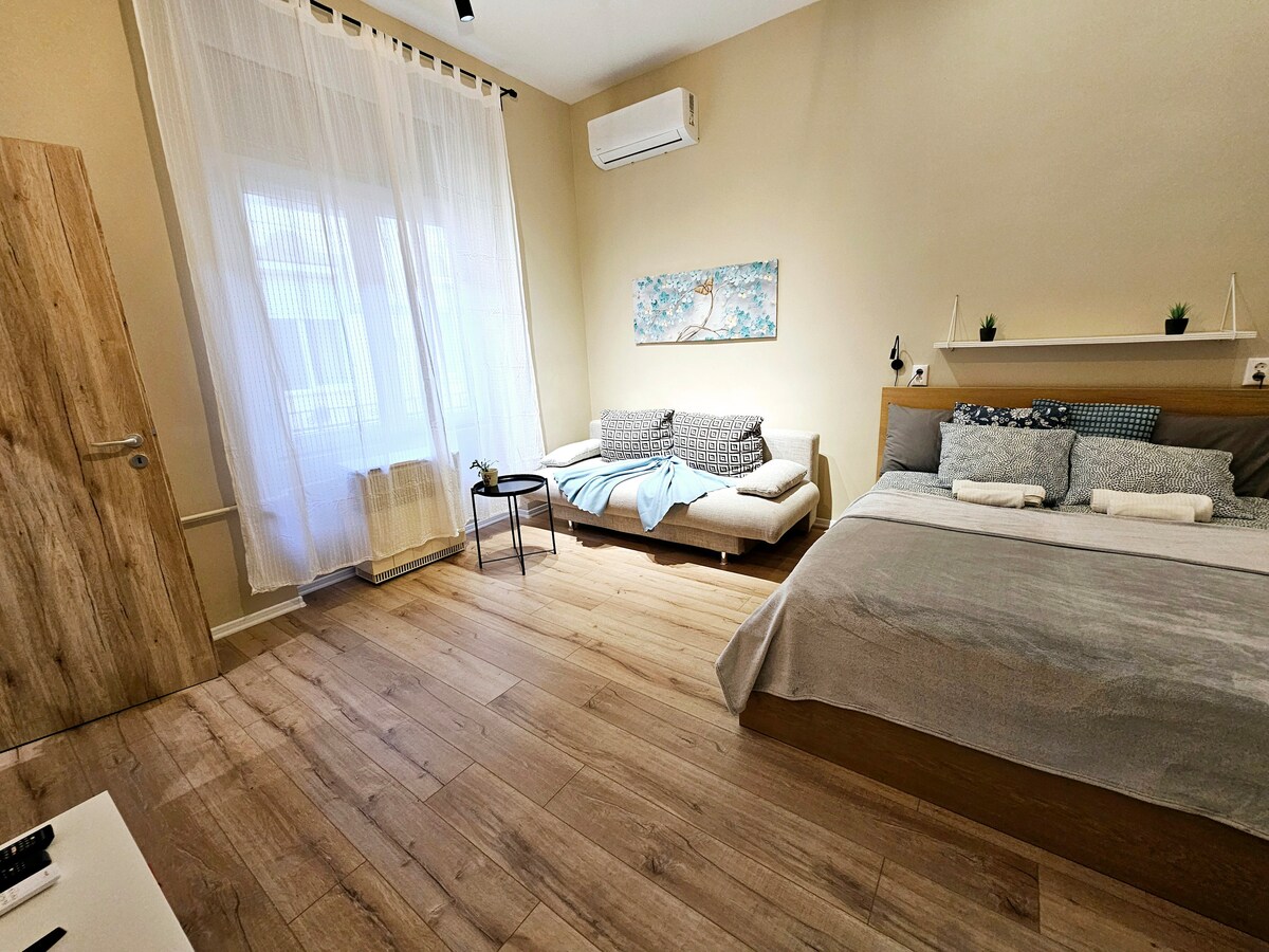 Apartament totalment renovat amb aire condicionat al centre de Budapest, al costat del districte de festes, però en un carrer tranquil, a 2 minuts del transport públic (autobús de l'aeroport, M2, M3, tramvia, autobús). Tant si vols anar de festa com si només vols explorar la ciutat, el lloc és ideal per a tu, però si vens a Budapest a aprendre, encara estaràs a prop.