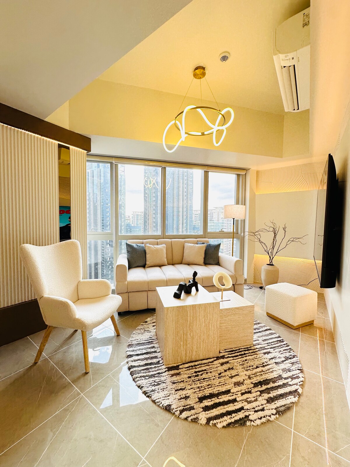 Et sentiràs elegant i gaudeix de l'ambient de BGC en aquest lloc cèntric. Aconsegueix accés directe a Uptown Mall. Aquest allotjament també es troba just a l'altre costat del nou centre comercial Mitsukoshi. El nostre espai recentment renovat és lluminós i espaiós, amb una vista fantàstica de l'espectacle de la font del centre comercial Uptown. Fes un passeig fàcil, ja que tots els punts d'interès principals estan a només uns minuts a peu. Sent l'energia de Uptown BGC. Compra, menja o simplement gaudeix d'un descans relaxant a la cafeteria de la cantonada. Vine a sentir l'energia d'aquesta vibrant comunitat!