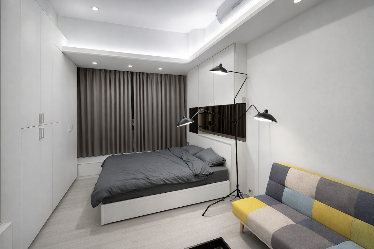 A 3 minuts a peu de l'estació de Guting MRT, a 1 minut de la parada d'autobús i d'UBIKE. Hi ha botigues de conveniència i supermercats a 5 minuts a peu. És un pis amb ascensor i seguretat les 24 hores. Inclou rentadora/assecadora, televisor, wifi de 100 M, sofà llit, armari, tocador/taula per a l'ordinador, nevera de doble porta, cuina bàsica amb estris i un lavabo separat amb bany complet, incloent-hi un escalfador/ventilador d'escapament (sense banyera). L'habitació està decorada en estil mediterrani amb sostres alts.