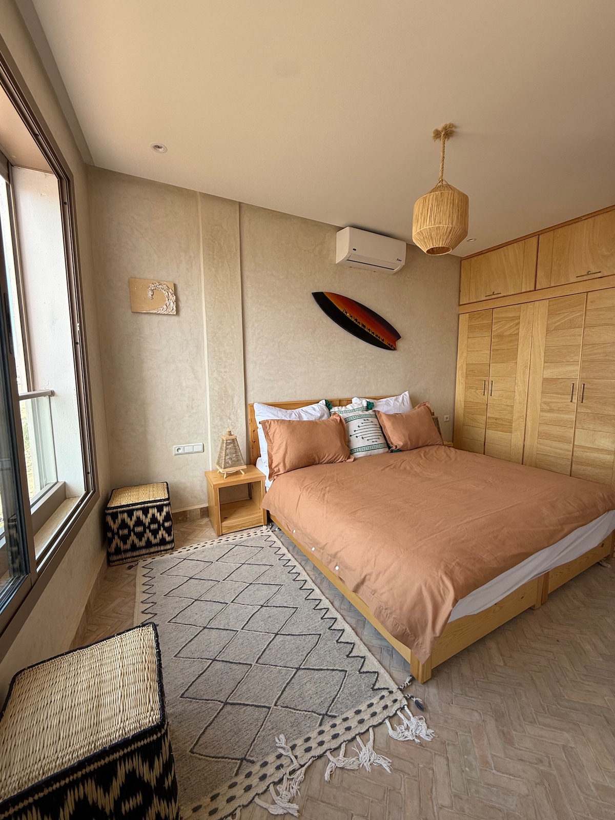 C'est le seul appartement dont le balcon de 17m2 est construit au dessus du chemin qui longe la plage, offrant une vue exceptionnelle sur les vagues, le village, les pêcheurs, les surfeurs. Très confortable, décoré et entretenu avec soin pour un séjour exceptionnel au dessus de l'océan, proche des nombreux cafés et restaurants longeant la plage et à 2 pas des écoles de surf, au coeur de ce village berbère convivial mêlant pêcheurs, commerçants, surfeurs du monde entier...et quelques touristes.