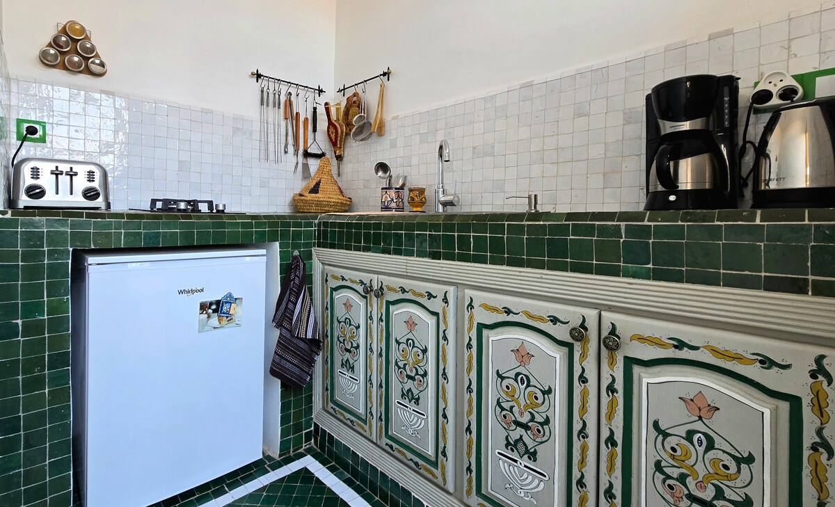 Dorm amb comoditat a només 10 minuts a peu de la medina de Taroudant! El nostre ampli apartament ofereix 2 dormitoris, cadascun amb bany privat, a més d'una terrassa al terrat amb cuina i jardí. Perfecte per a famílies, parelles o amics. Gaudeix d'una wifi ràpida, d'un autèntic estil marroquí i d'un accés fàcil als zocs, cafès i a les muntanyes de l'Atles. Descobreix Taroudant, la «petita Marràqueix», en un entorn tranquil i autèntic.