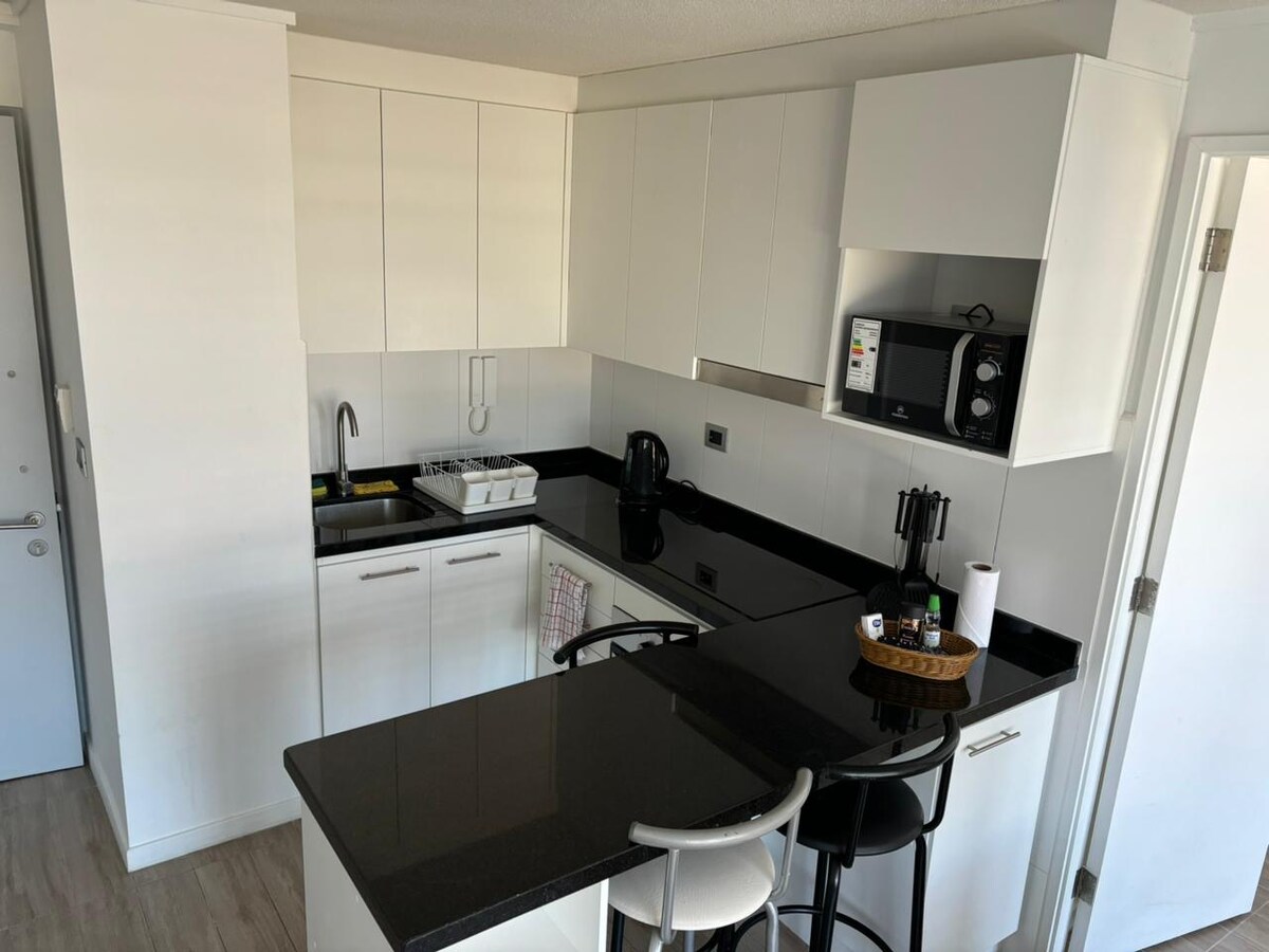 Arriendo departamento full equipado en la ciudad de Valdivia para vacaciones ideales o estancia cómoda para 2 a 3 personas. Este se encuentra emplazado en condominio cerrado. Cuenta con un dormitorio, living con futón, cocina americana, walking closet, baño y lavadora, además posee una terraza con barra, Wi-fi. Existe negocio de abarrotes en el mismo edificio y posee locomoción caminando a menos de 5 min, supermercado a 10min. Se aceptan mascotas previo aviso 😊🐾