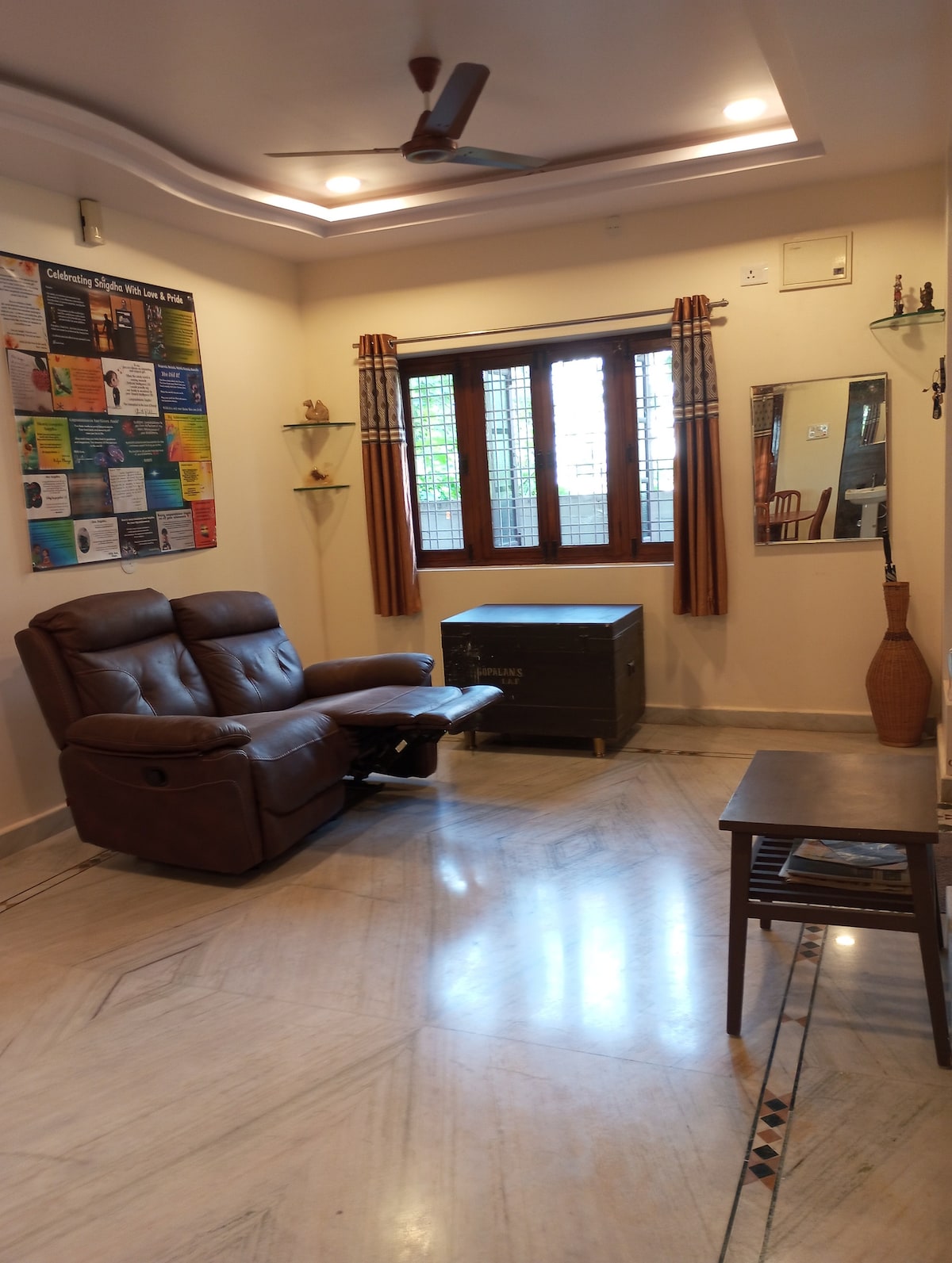 Prestacions: Sala d'estar amb aire condicionat i televisor intel·ligent de 65 polzades Menjador 3 habitacions amb aire condicionat i bany privat Servei de neteja diari Taula TT Rentadora Cuina equipada Microones, bullidor, arrossera, purificador d'aigua Nevera 3 gèisers Aparcament gratuït Gaudeix de la tranquil·litat al nostre encantador pis 3BHK per fer una escapada tranquil·la. Relaxa't a la sala d'estar, amb un gronxador perfecte per relaxar-te després d'un llarg dia. Situat en un barri tranquil, és ideal per a qualsevol persona que busqui un refugi serè!