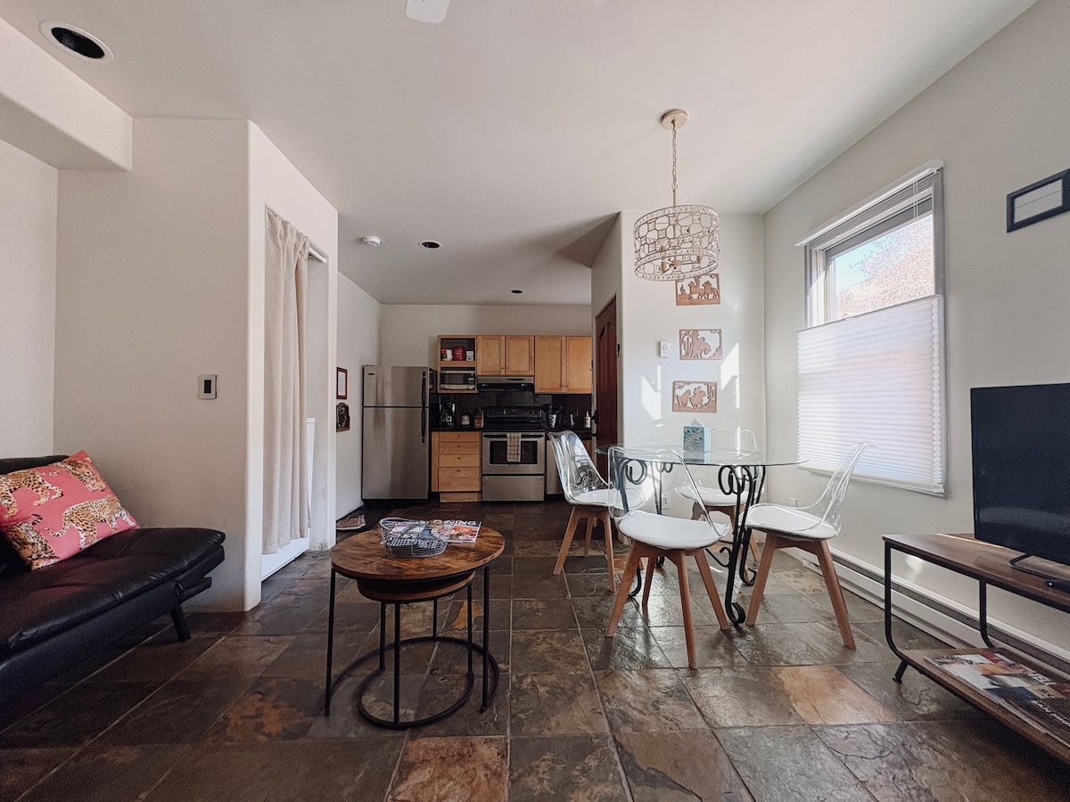 Aquest preciós apartament està convenientment situat a l'impressionant Valley Floor. A 2 milles a peu, en bicicleta, en autobús o en cotxe de Telluride. Gaudeix d'una gran llum natural, una terrassa privada, una llar de foc, sostres abovedats i llits còmodes. L'entorn és ideal per a parelles, aventurers solitaris, viatgers de negocis i famílies que busquen un lloc per relaxar-se després d'esquiar, fer senderisme o gaudir del festival d'estiu. Amb cuina completa, bany (amb banyera), rentadora i assecadora i tot el que necessites per a la teva estada.