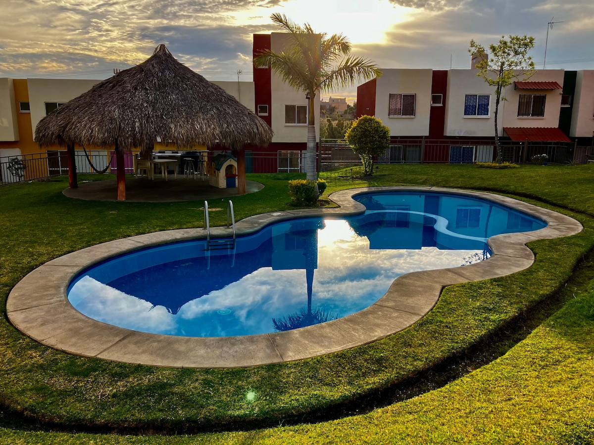 Casa con alberca enfrente, contamos con internet para realizar el trabajo en casa (Home Office), ideal para fines de semana o vacaciones. Haz el estrés a un lado y llega a un lugar tranquilo y sin tantas personas a tu alrededor. Muy cercana al balneario "Exhacienda de Temixco" (15 min caminando). Oxxo en la esquina del fraccionamiento. Perfecto para quienes ocupen descansar después de asistir a sus eventos en "Las Brisas" o "Burgos".