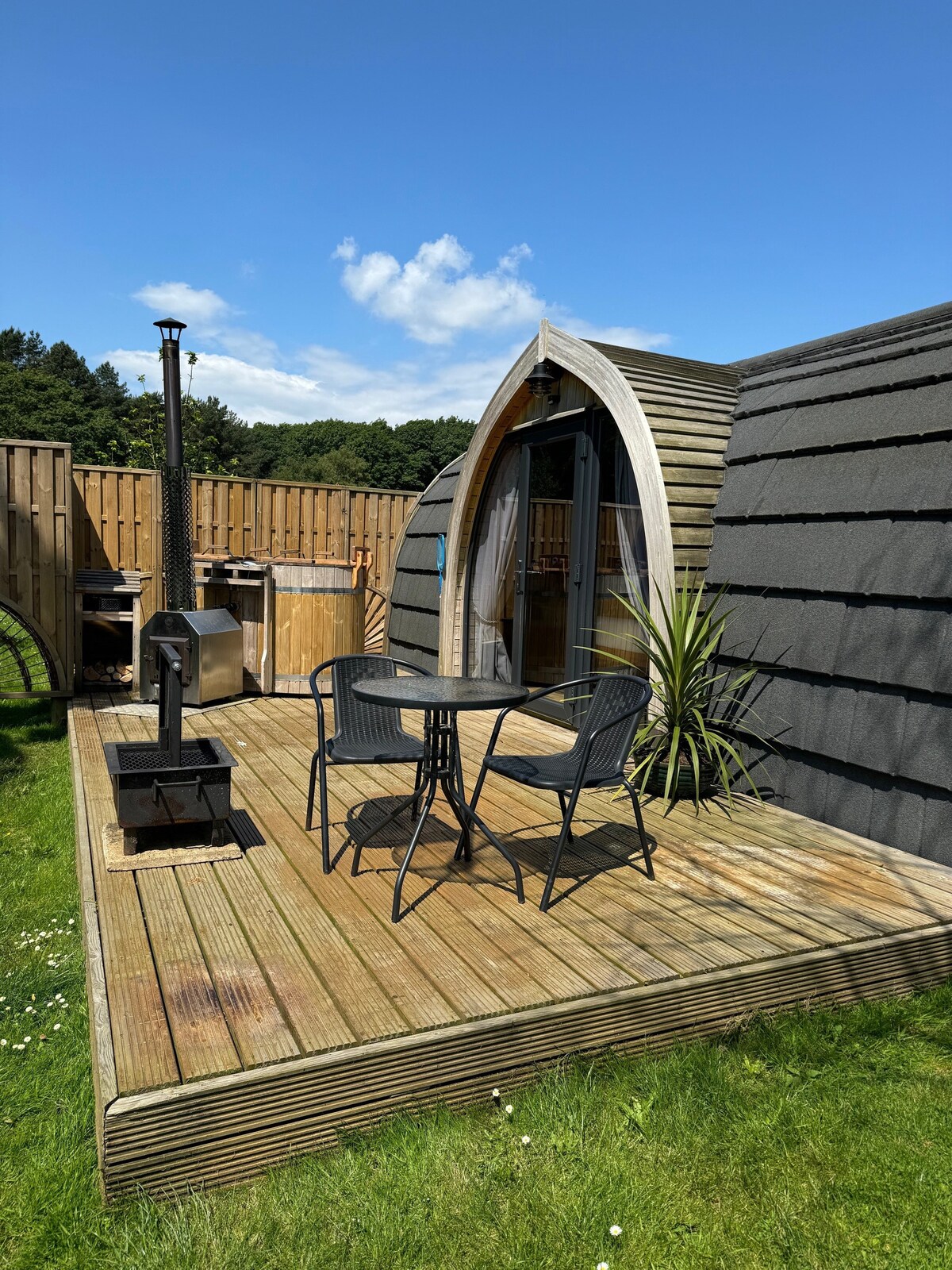 Set on an adult only rural glamping site, the pod is a clever use of space with great views to the outside. It has a kitchenette at one end with a breakfast bar and a bathroom with toilet, shower and basin at the other end. The double bed is made up with luxurious bed linen with a dressing table, vanity mirror and wardrobe next to it. Outside there is a large decked area with its own wood-fired hot tub and bbq where you can enjoy views over the water and ancient woodland.