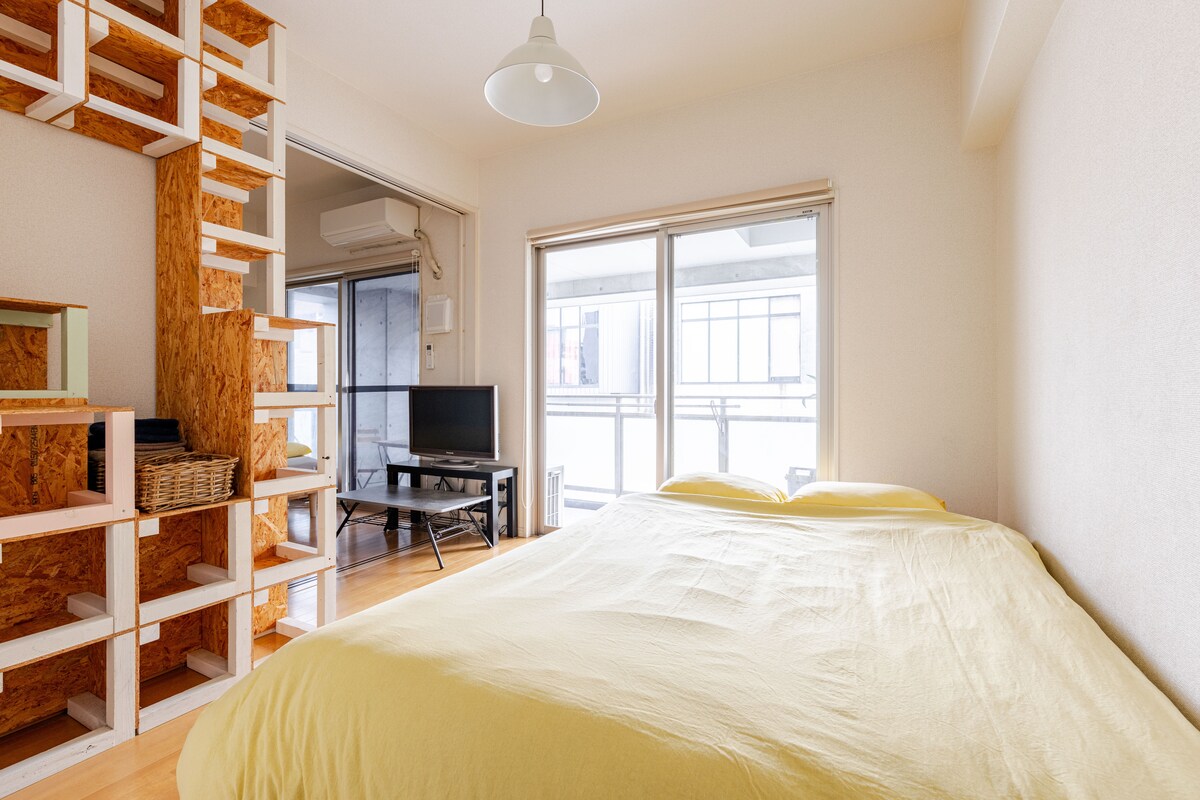福岡「地下鉄天神駅」から徒歩5分。マンションの一室を改築。ダブルベッド1台にソファベッド1台。