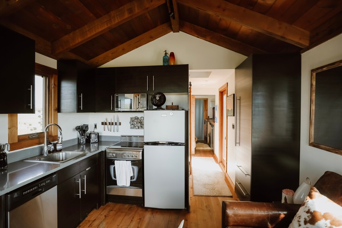 Truly unique stay! With a stunning location & view, this beautiful tiny house is nestled at the top of the Teton Valley and puts you in the perfect spot to access some of the country's best National Parks, ski resorts, fishing rivers, and bike trails. With a full bathroom/shower/kitchen/laundry this tiny has an ultra-comfy living space that is laid out in a way that creates distinct separate spaces to hang out and works perfectly for couples, small groups of adventure buddies, or small families.