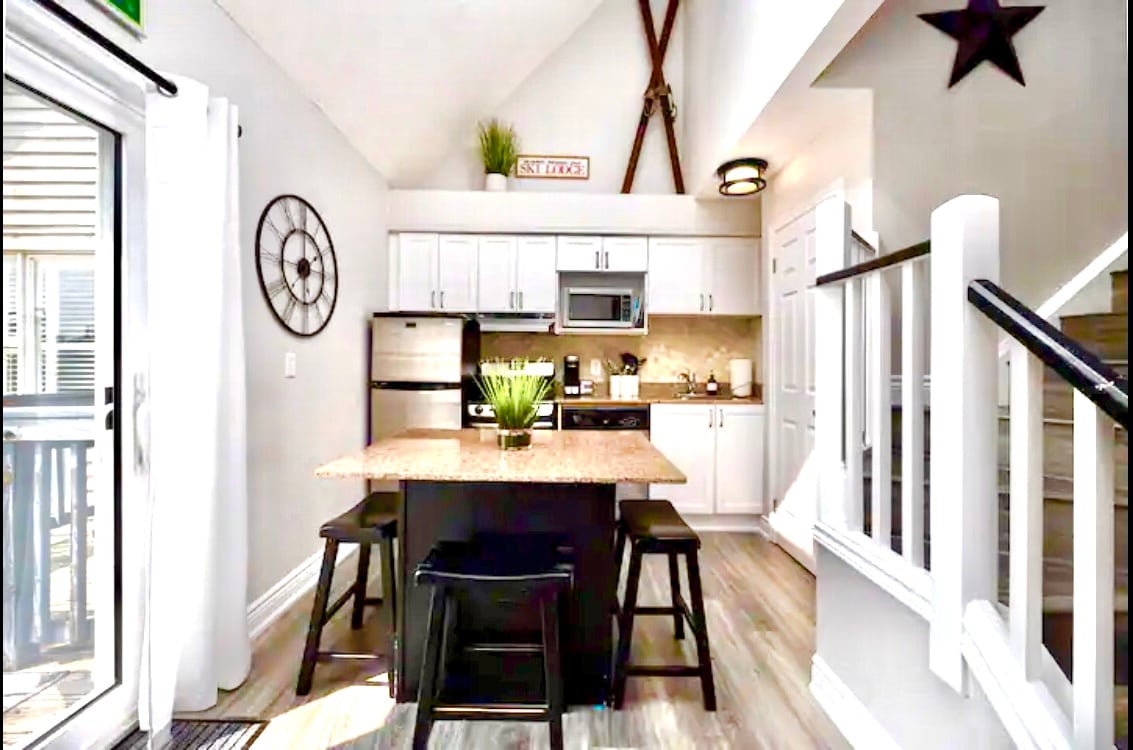 Preciós loft de 2 pisos a la base de la muntanya. Capacitat per a 4+ 2 persones. Rutes darrere de l'edifici, transport gratuït de 5 minuts a Village, restaurant, piscina i pista de tennis de temporada, banyera d'hidromassatge i barbacoa durant tot l'any. 1 llit queen, 1 sofà llit queen, 1 llit doble Murphy i 2 banys complets. Televisor intel·ligent a la planta superior i cable a la planta principal per sobre de la llar de foc elèctrica. Tot el que necessites per cuinar. Taquilla exterior per a equipament esportiu. Aquest és el nostre allotjament, no un hotel, i allotja't aquí sovint. Sigues respectuós amb la nostra propietat.