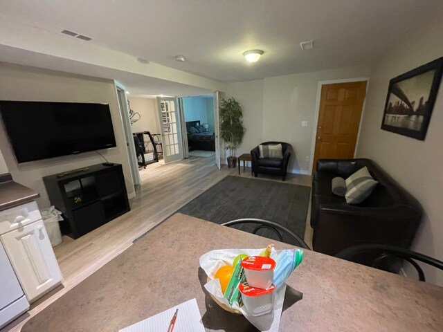 Recentment hem renovat el soterrani per crear una suite d'hostes elegant, moderna, acollidora i tranquil·la. Hi ha una entrada lateral que s'obre directament a les escales que et porta fins a l'allotjament. Disposa d'una porta exterior metàl·lica amb pany per a insonorització i seguretat. L'habitació és un apartament d'estudi lluminós amb tres finestres grans, cuina completa, sala d'estar amb televisor i llar de foc, taula de menjador, llit queen size, vestidor i bany privat amb dutxa de cinc peus. Amb una exhaustiva insonorització!