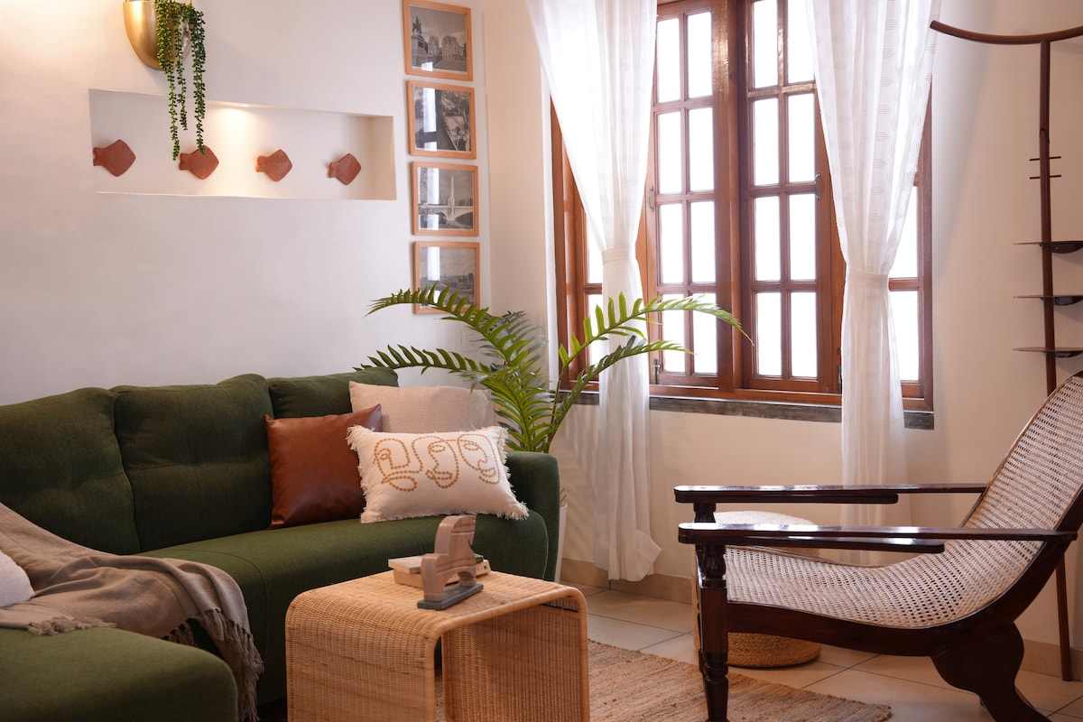 Your home away from home in Auroville has been tastefully decorated to a Chettinad theme. Every corner of our home is Instagramworthy with colourful interiors, kolam art, antique decor and more. The 1BHK can comfortably accommodate up to 4 persons with a swing bed and sofa bed in the living room. hile there are plenty of restaurants nearby, our kitchen has been thoughtfully equipped for all your needs - be it to make a quick omelette or a full Indian meal. So sit back, relax and sip your coffee.
