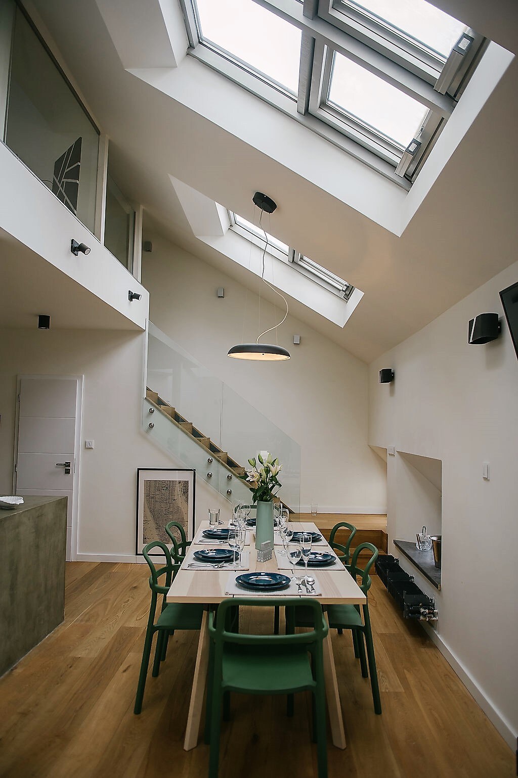 UN APPARTEMENT ATYPIQUE Un appartement en sous-sol de 80m2, une chambre de plus de 20m2, 7m de hauteur sous plafond, le charme des voutes en brique. UN DESIGN MODERNE POUR UN LIEU AVEC UNE HISTOIRE L'appartement a été conçu par un architecte et est neuf. Dans les années 70 se trouvaient ici les ateliers d'un artisan vitrier. GRAND CONFORT Prenez un sauna en musique après une longue journée de visites. Un lit king size vous attend pour une nuit réparatrice.